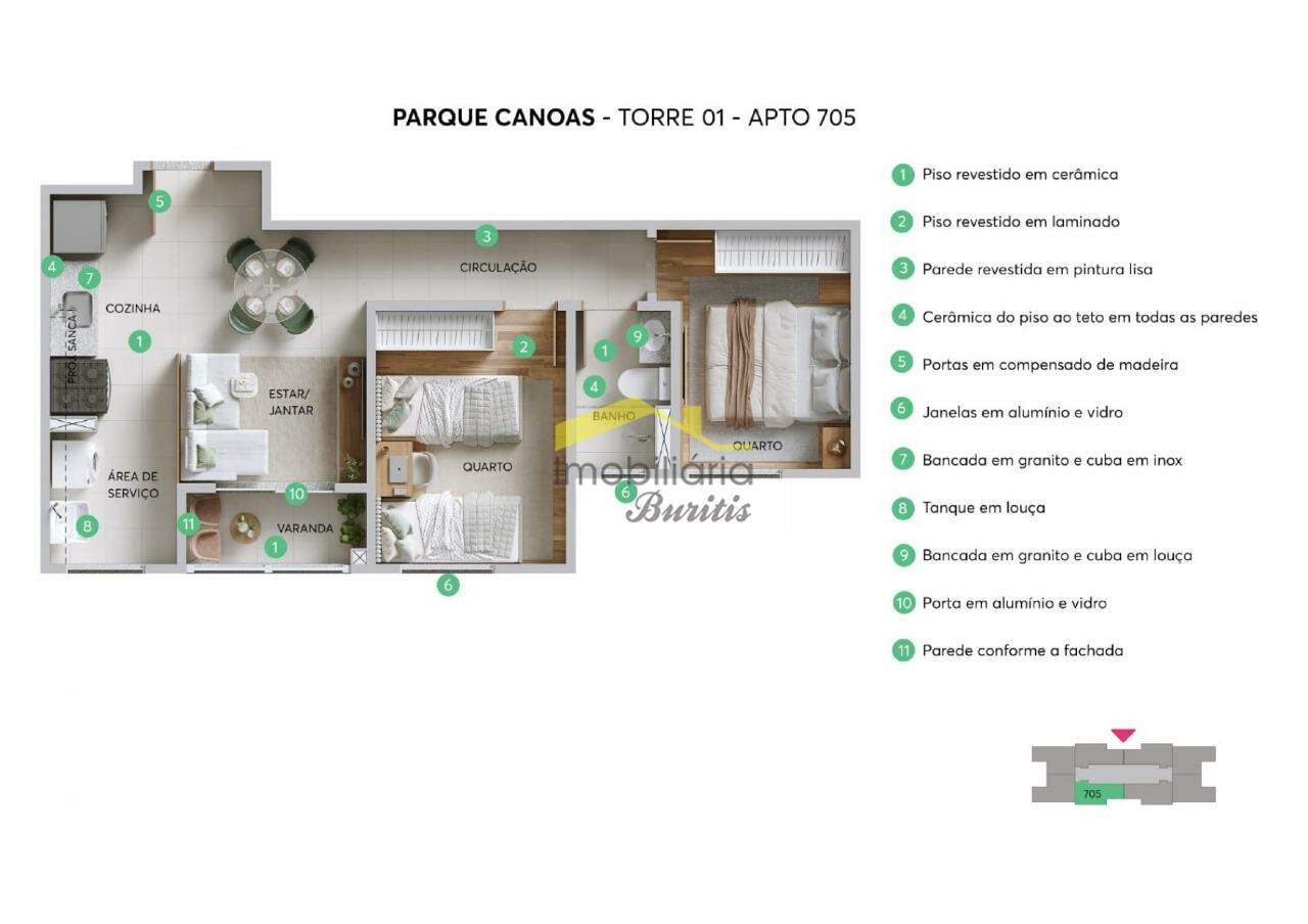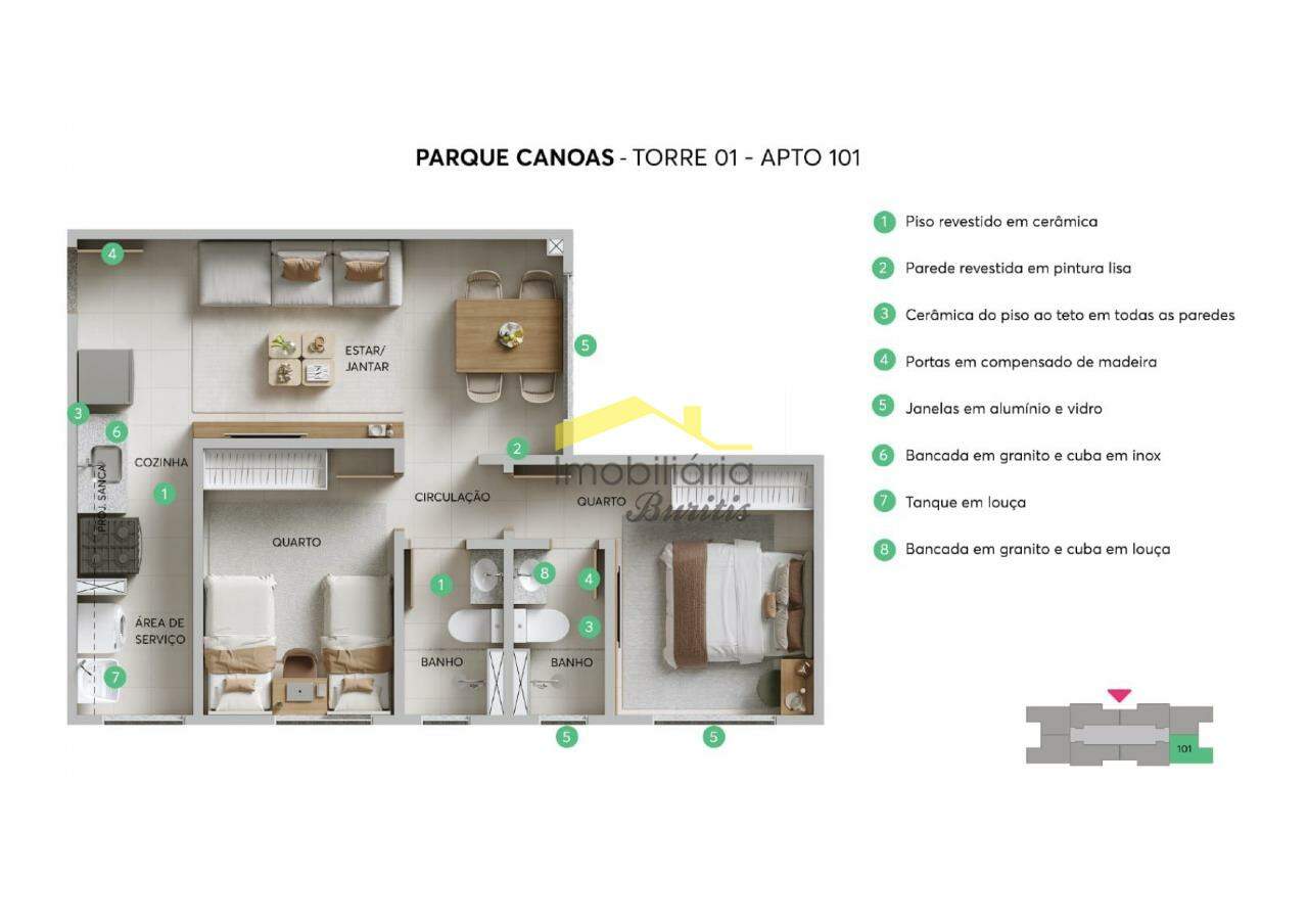 Piso revestido em cerâmica e laminado, parede com pintura lisa, cerâmica do piso ao teto em todas as paredes, portas em compensado de madeira, janelas em alumínio e vidro, bancada em granito e cuba em inox,
