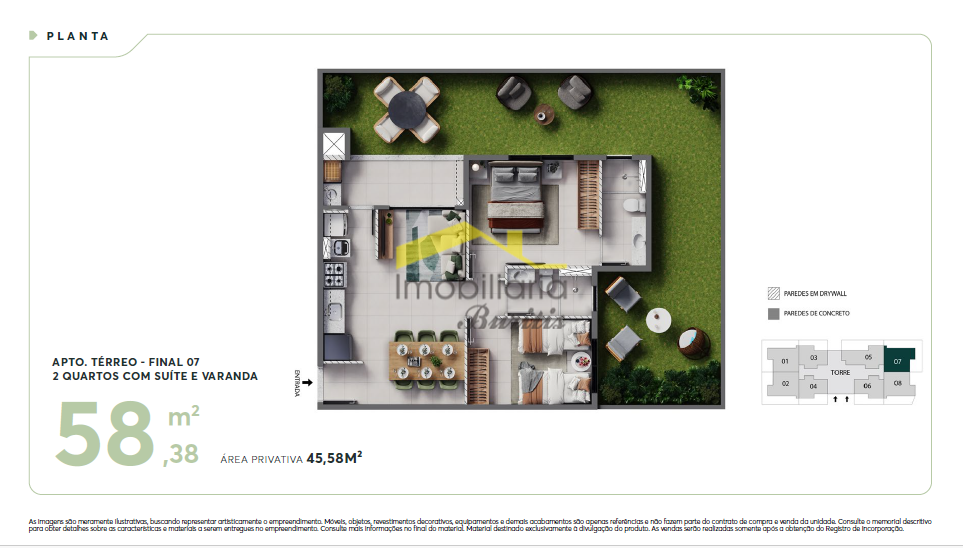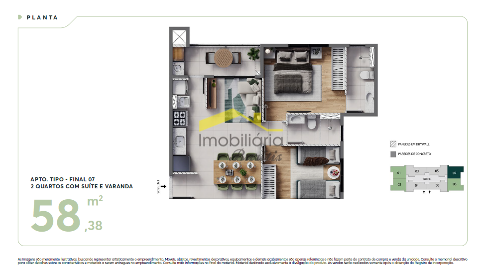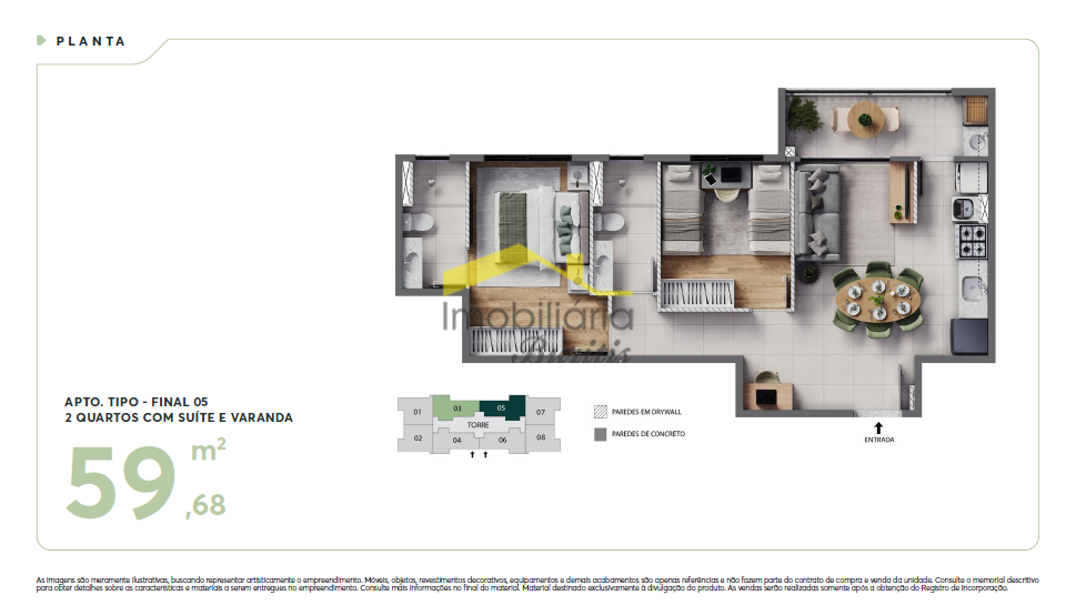 Unidades de 2 Quartos com Suíte – 59,68 m² com varanda