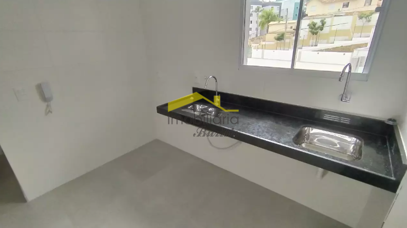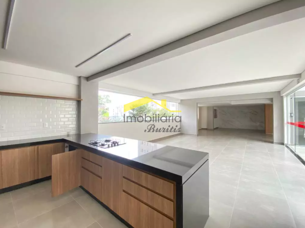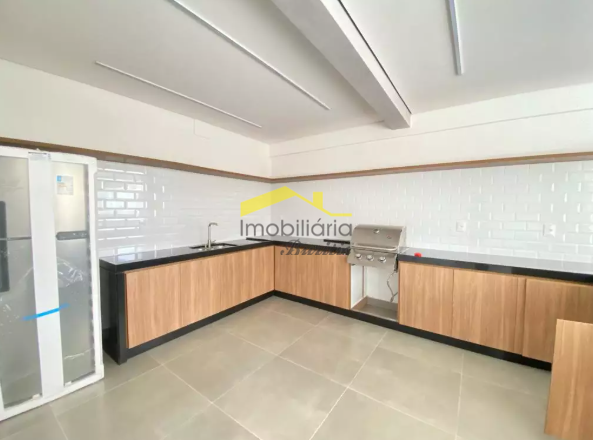 A cozinha, também em porcelanato, conta com bancada em granito e se conecta à área de serviço, proporcionando praticidade no dia a dia.