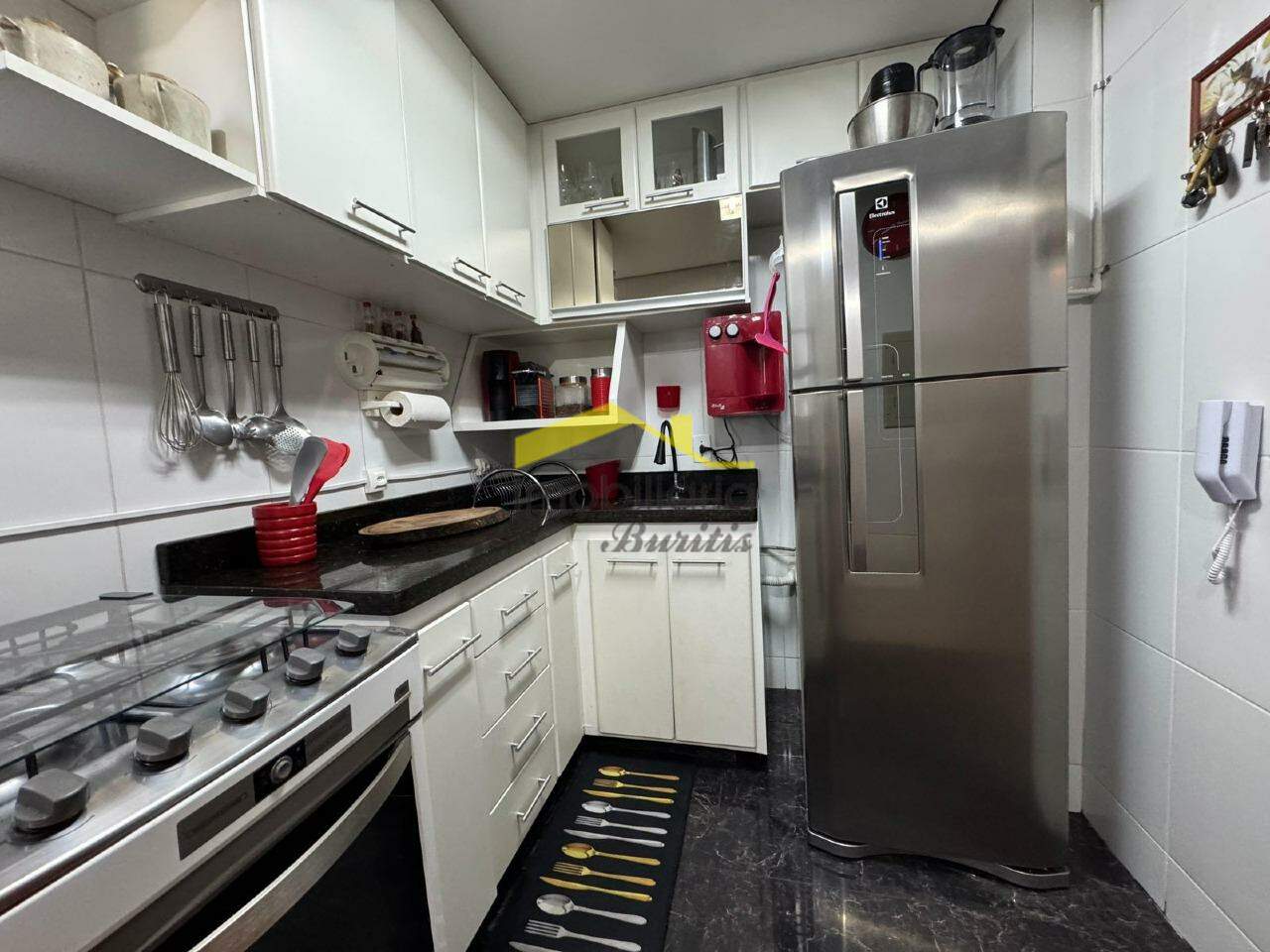 A cozinha planejada apresenta armários brancos, bancadas em granito e excelente iluminação natural, oferecendo praticidade e beleza no dia a dia.