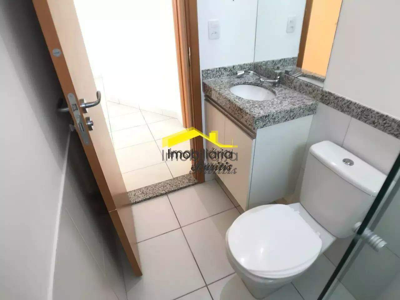 Banho social com bancada em granito e piso em cerâmica.