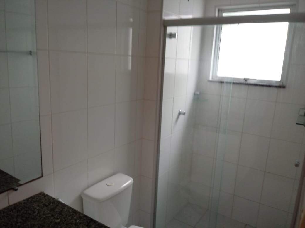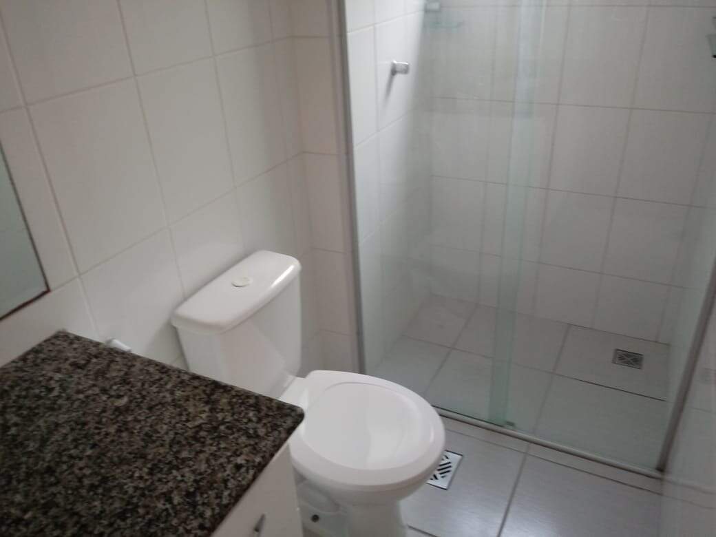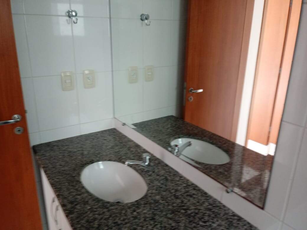 Banho social com piso em cerâmica, armário, bancada em granito, box em blindex e espelho.