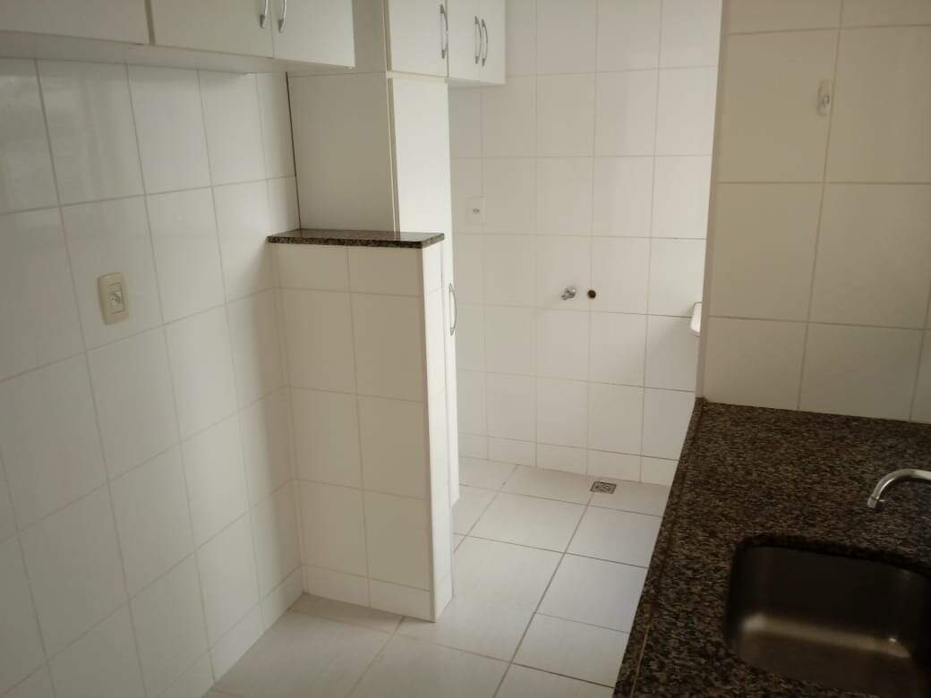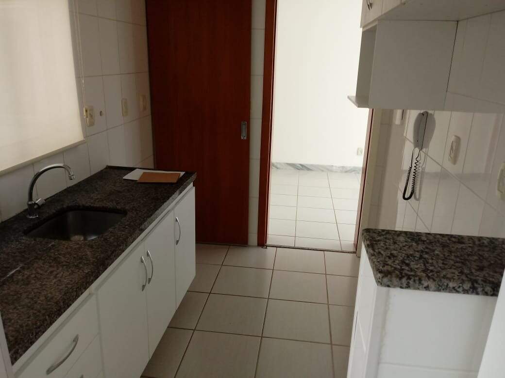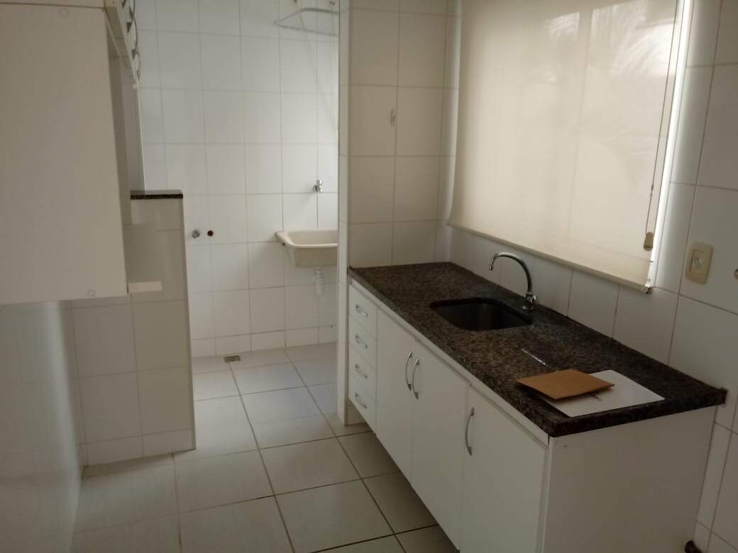 Cozinha montada com armários planejados, sob e sobre bancada em granito e piso em cerâmica.