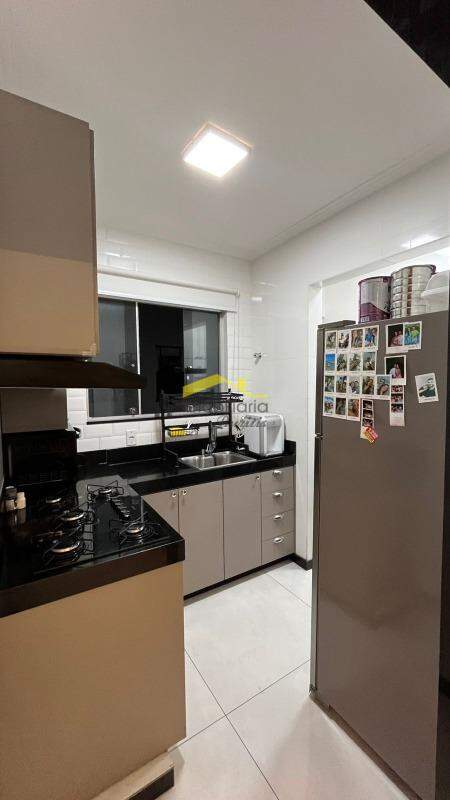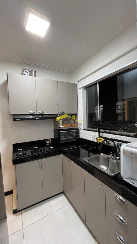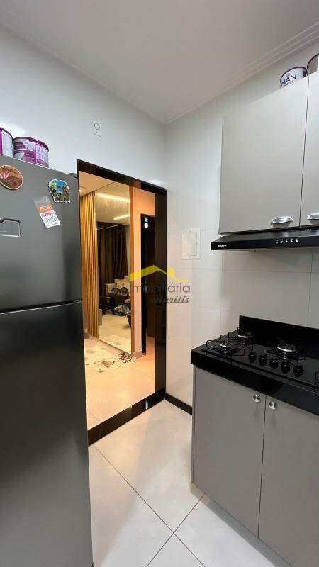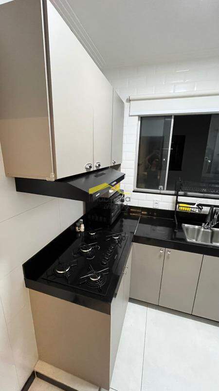 - Cozinha moderna com armários planejados, fogão cooktop e portas de vidro
