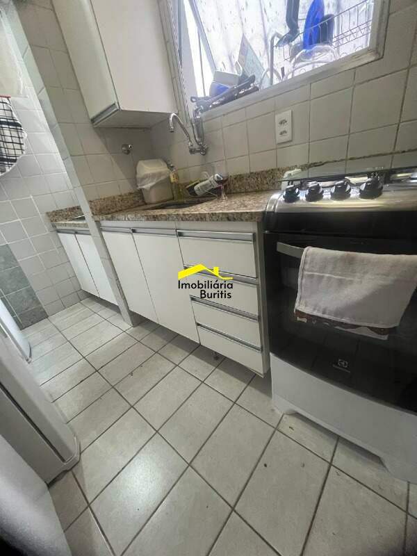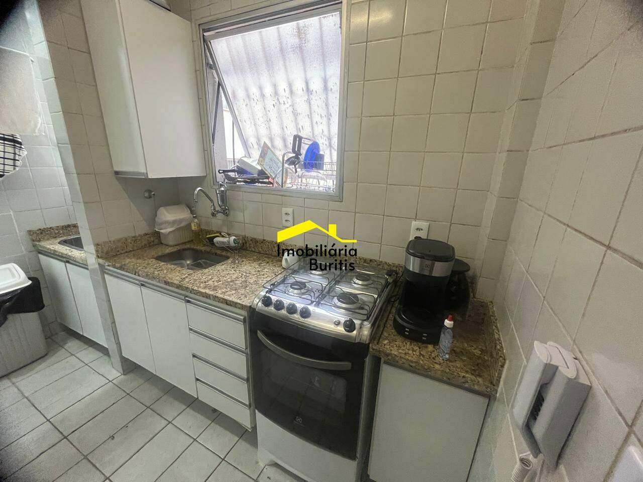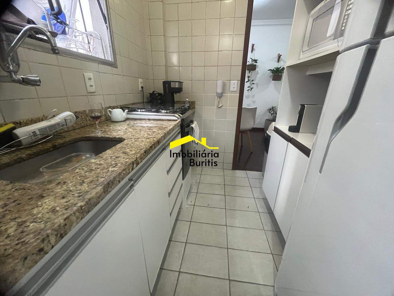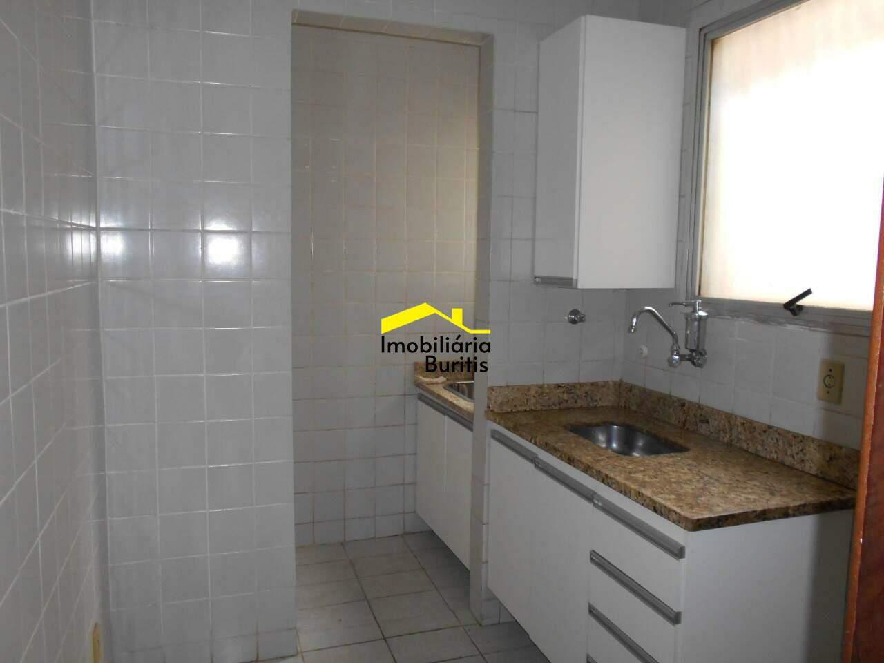Cozinha com piso em cerâmica, armários sob e sobre bancada em granito.