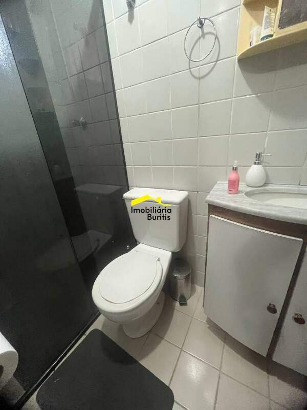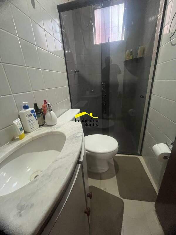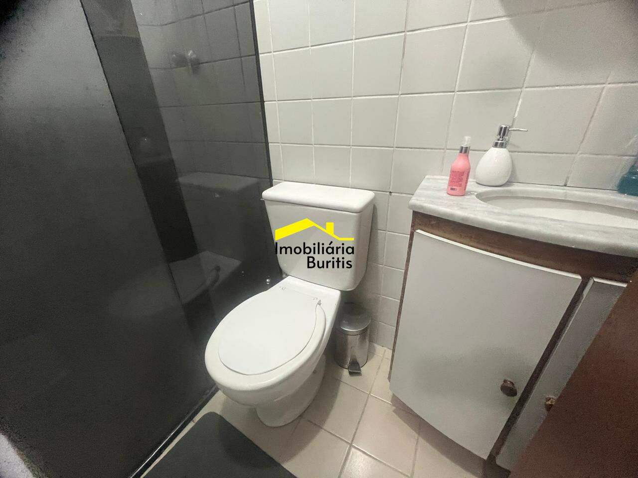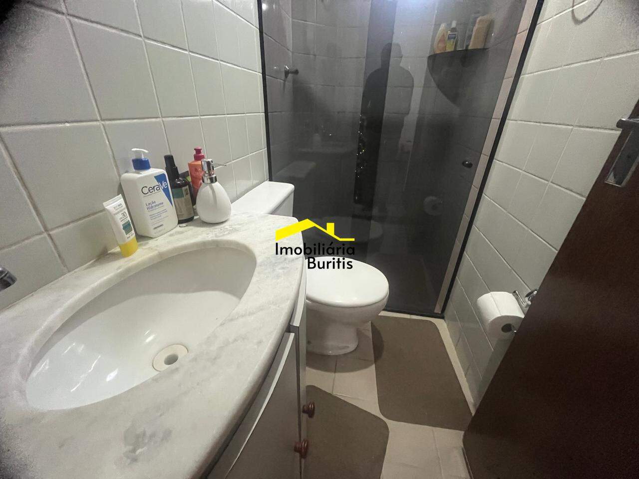 Banheiro social e suíte com piso em cerâmica e box em vidro .temperado e armário sob bancada em mármore.