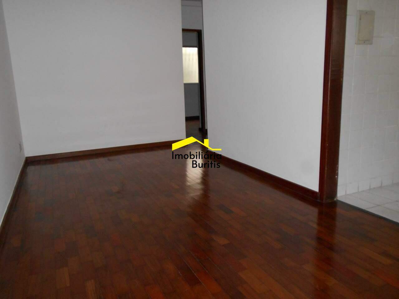 Sala para dois ambientes com piso em taco.