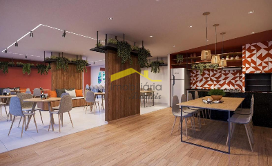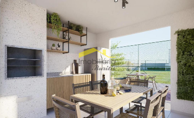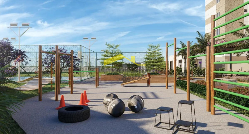 Prédio com elevadores, salão de festas, quadra, espaço gourmet com churrasqueira, academia, horta, praça, piscina, playground, bicicletário e campo gramado.