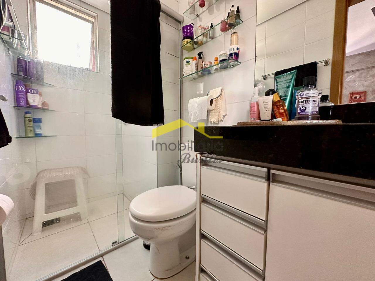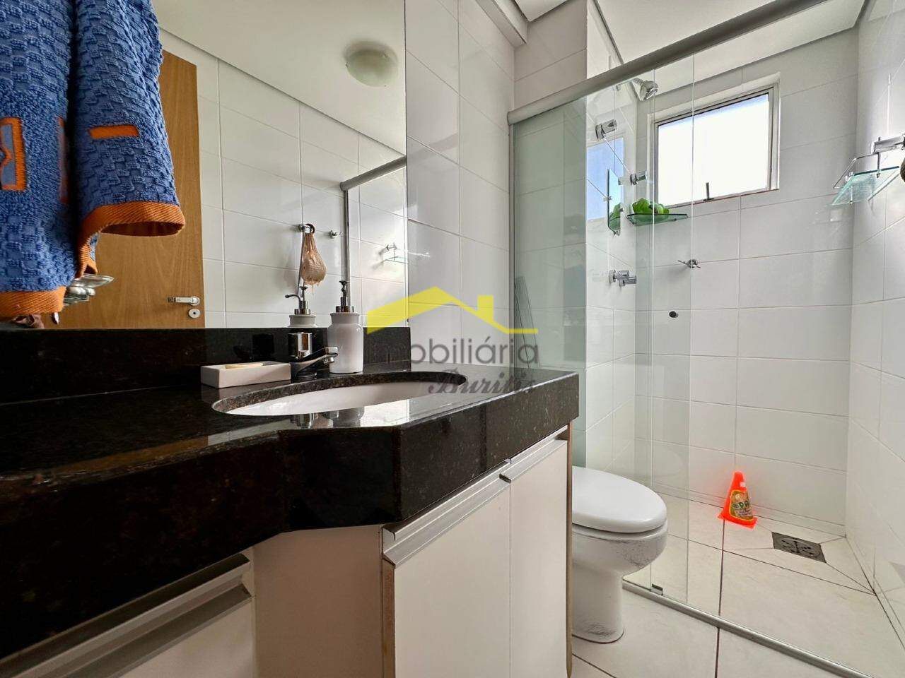 Banho social e suíte com aquecimento a gás, piso em porcelanato, bancadas em granito, box blindex e armários