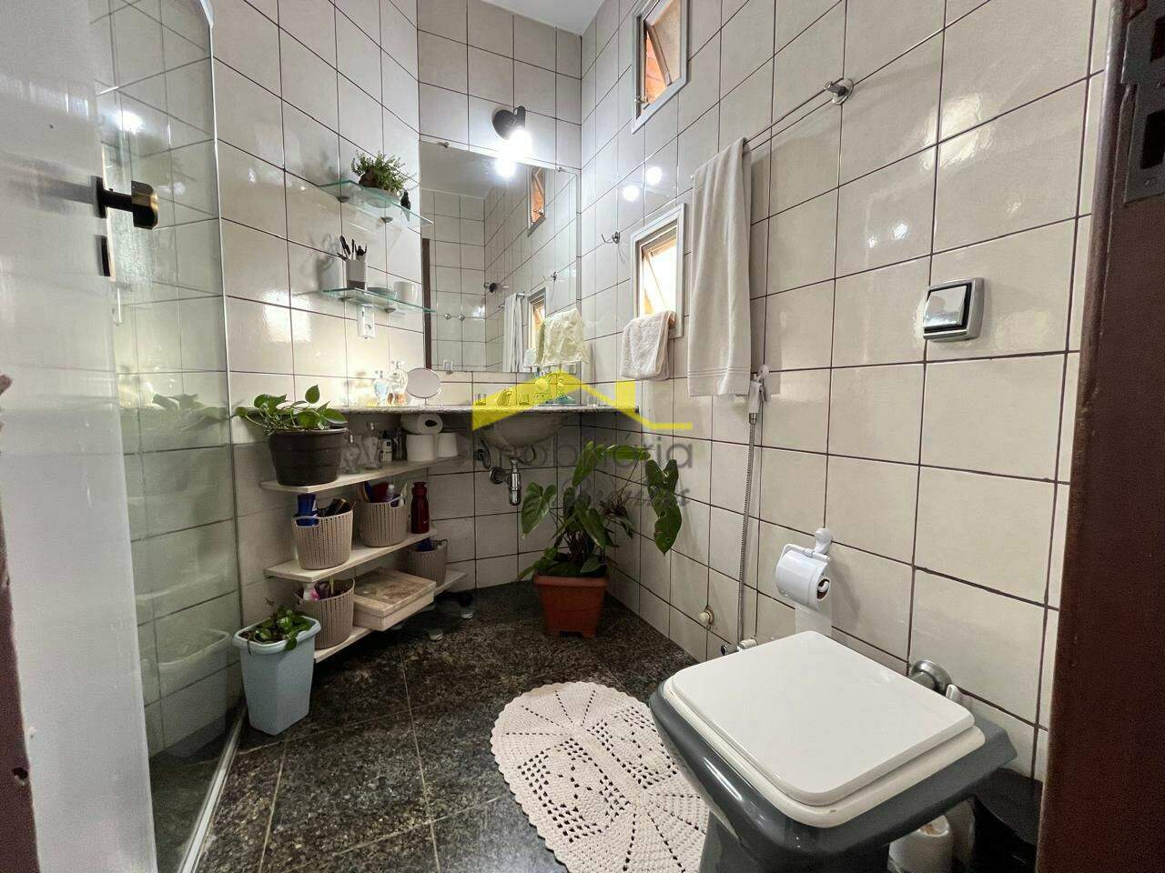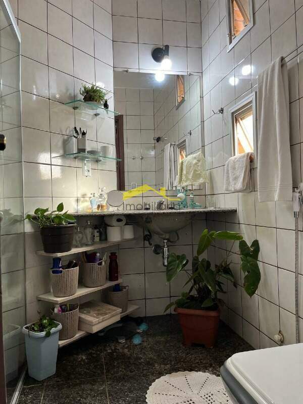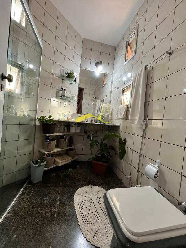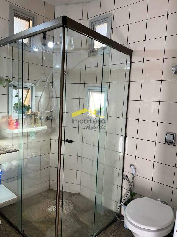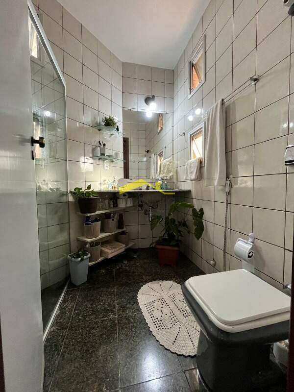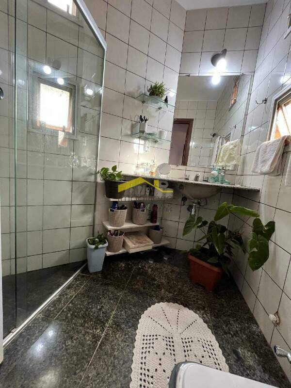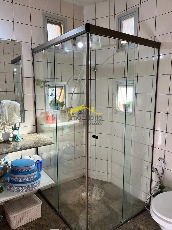 Banheiros - Suite e social com piso em granito, pia com bancada, box blindex, espelho grande.