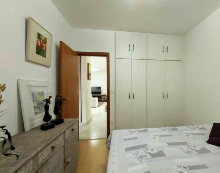 -Três quartos , sendo uma suíte , todos com armários e piso laminado de madeira .