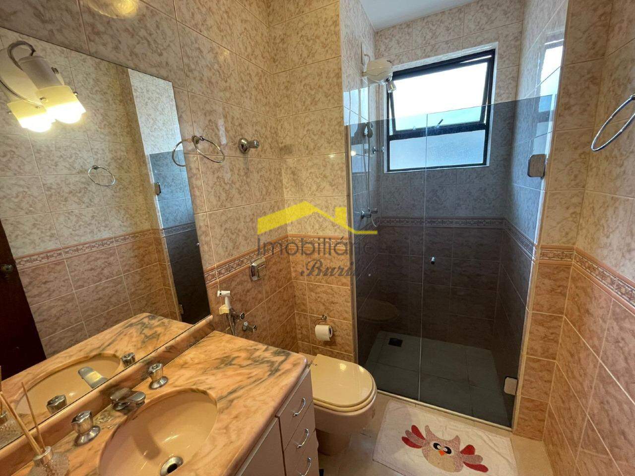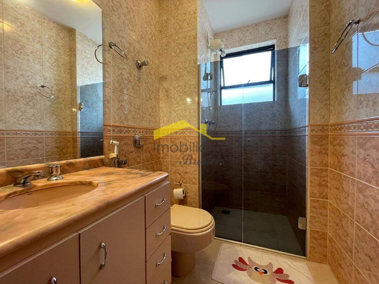 Banhos social e suíte com bancada em granito, armários e box em blindex.