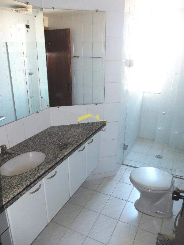 Banheiro social e suíte com piso em cerâmica, armário sob bancada em granito e box blindex;