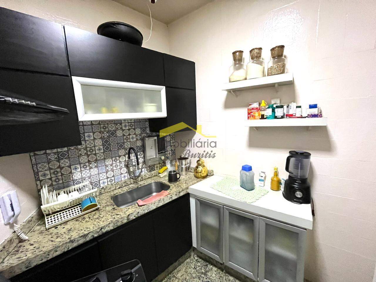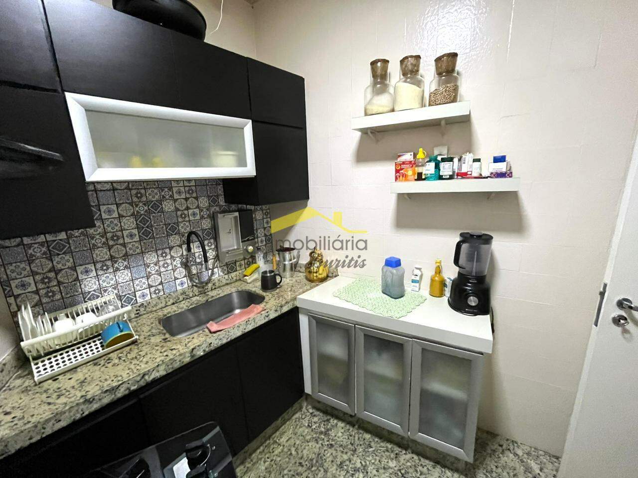Cozinha com piso e bancada em granito, armários