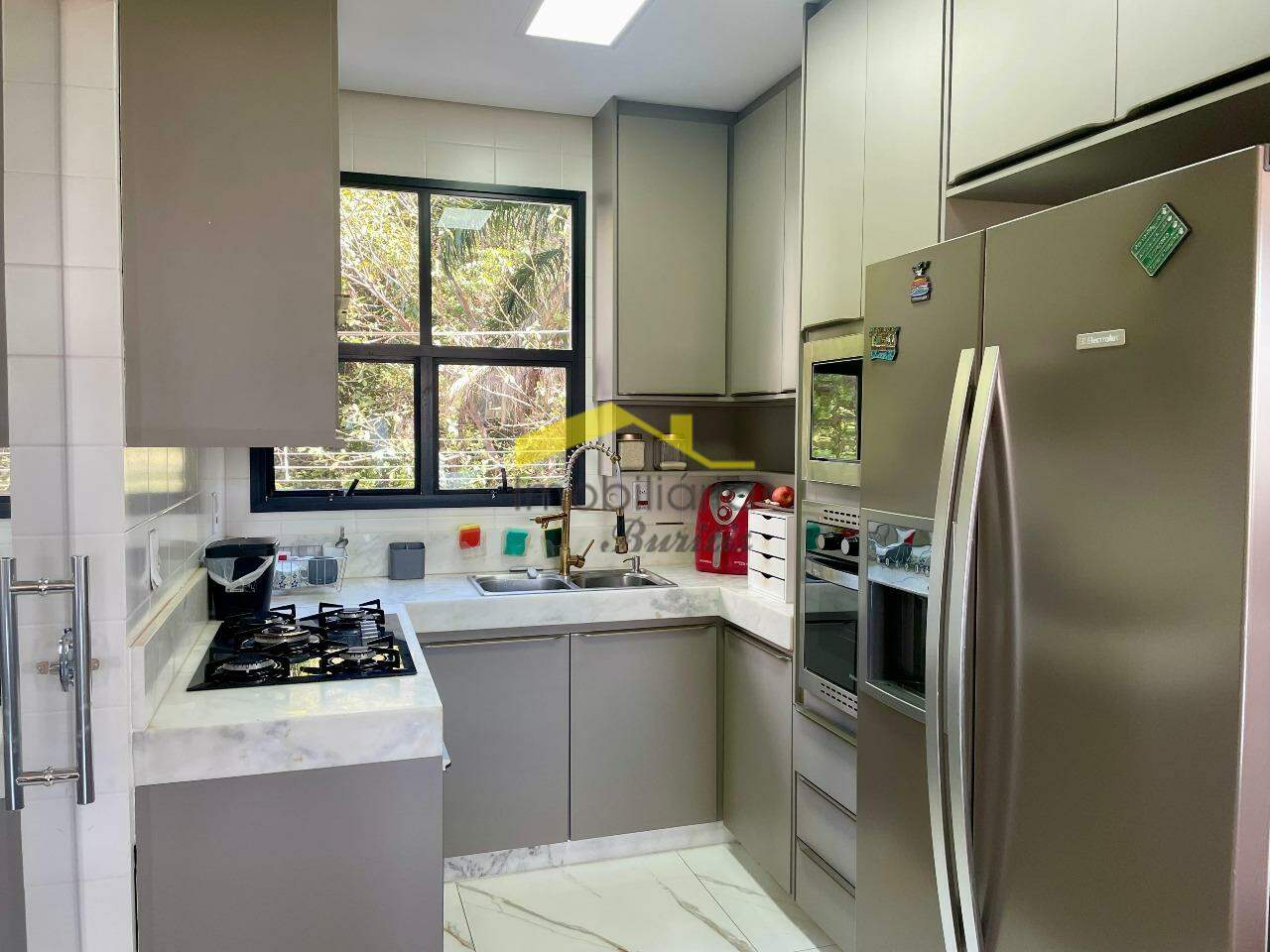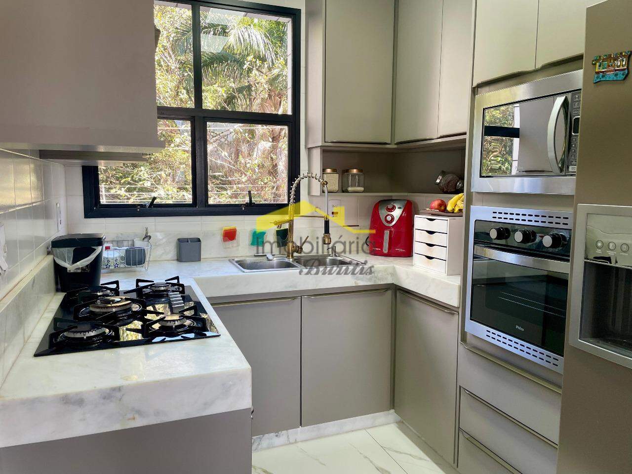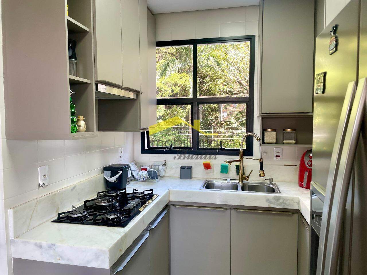 Cozinha: Planejada, com armários modernos em tons neutros, bancada e revestimento em mármore, equipada com cooktop, forno embutido e espaço otimizado.