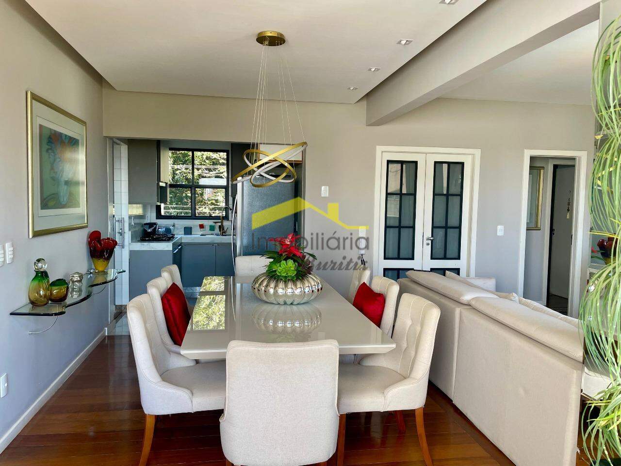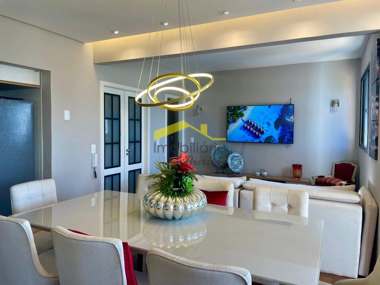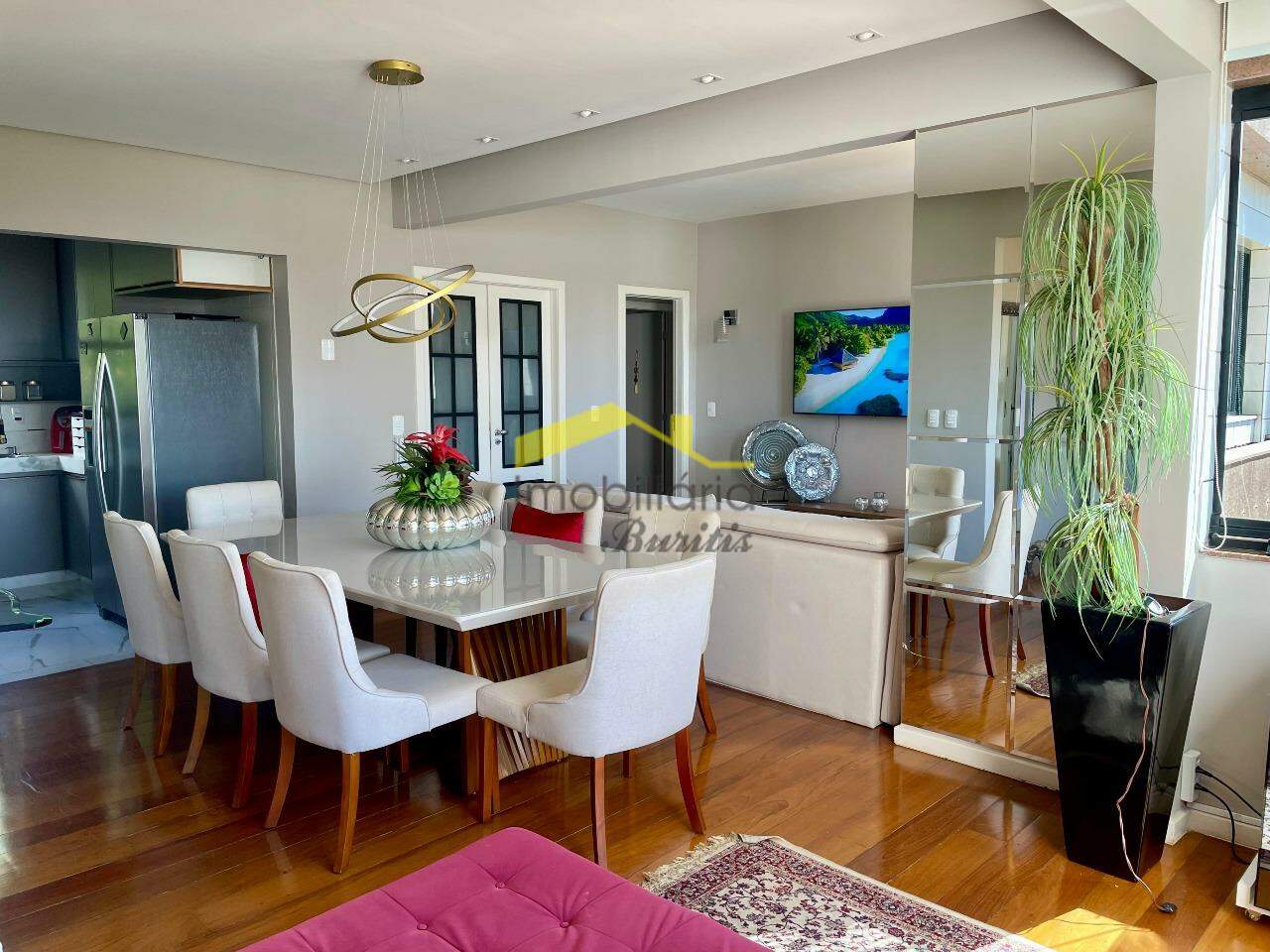 Área social: Sala ampla para dois ambientes, com projeto de iluminação embutida, móveis modernos e grandes janelas que proporcionam excelente luminosidade natural. Espaço de jantar integrado, com mesa imponente, cadeiras estofadas e decoração refinada.