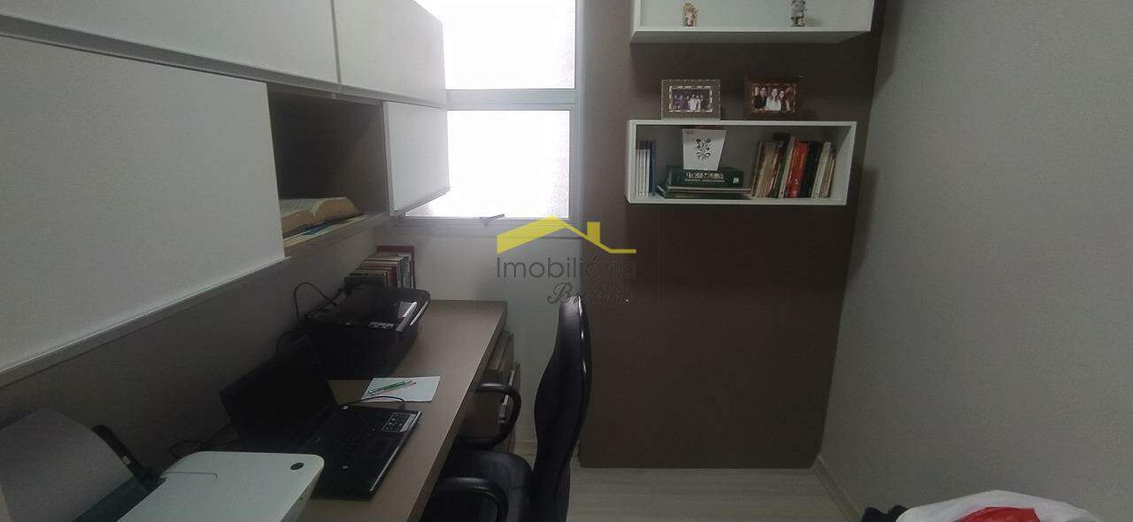 Sala para 2 ambientes em porcelanato, teto rebaixado e iluminação indireta. Varanda em porcelanato incorporada à sala, com fechamento em cortina de vidro. 3 quartos em laminado de madeira com armários, sendo 1 suíte com varanda em porcelanato. Escritório montado. Banheiros social e suíte em porcelanato com bancadas em mármore, armários, box em vidro temperado e espelhos. Cozinha em porcelanato com bancadas em granito e armários planejados. Área de serviço independente em porcelanato. Banheiro de empregada.