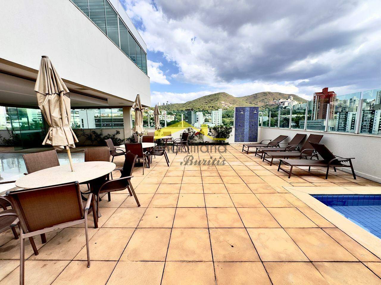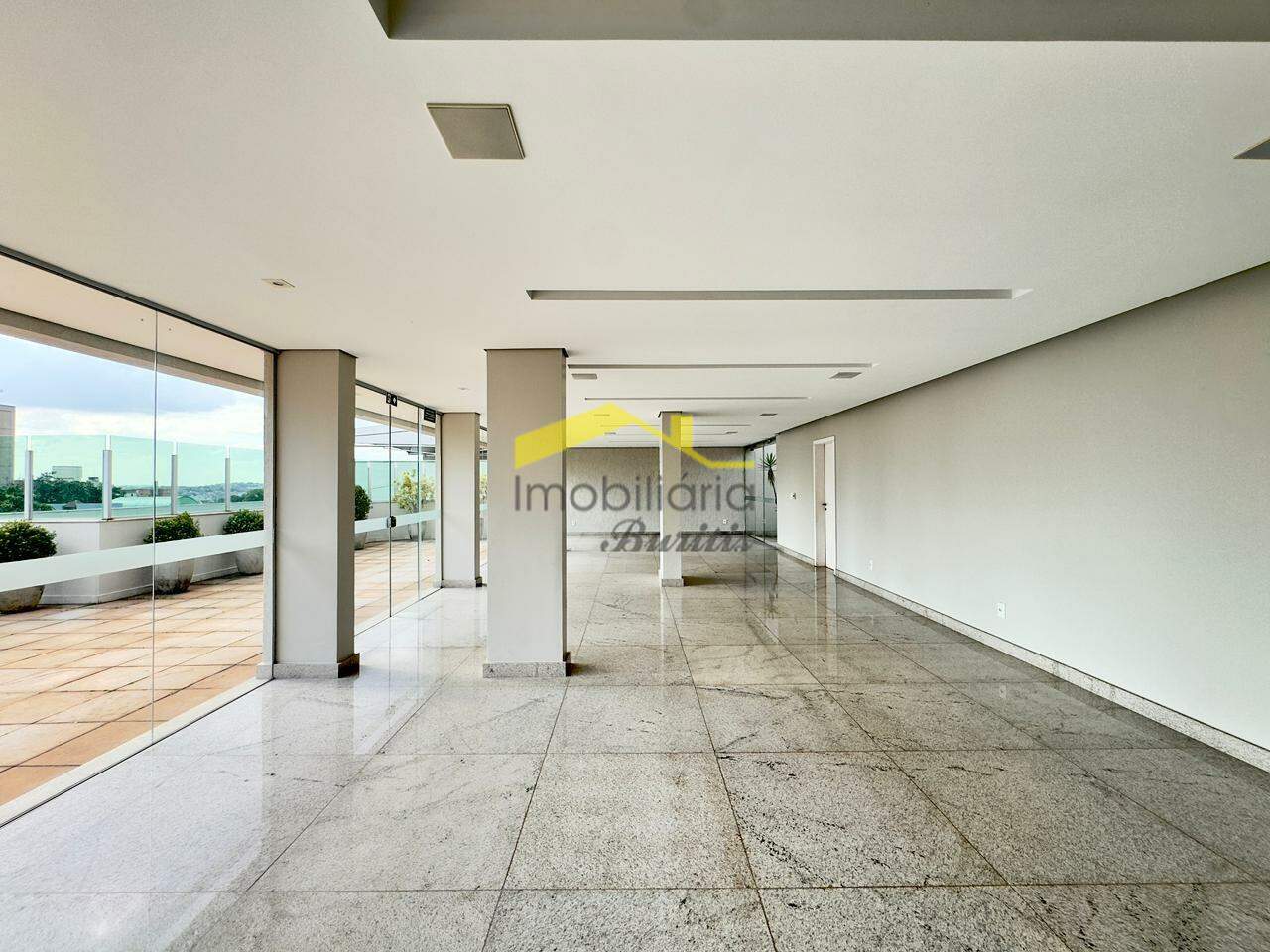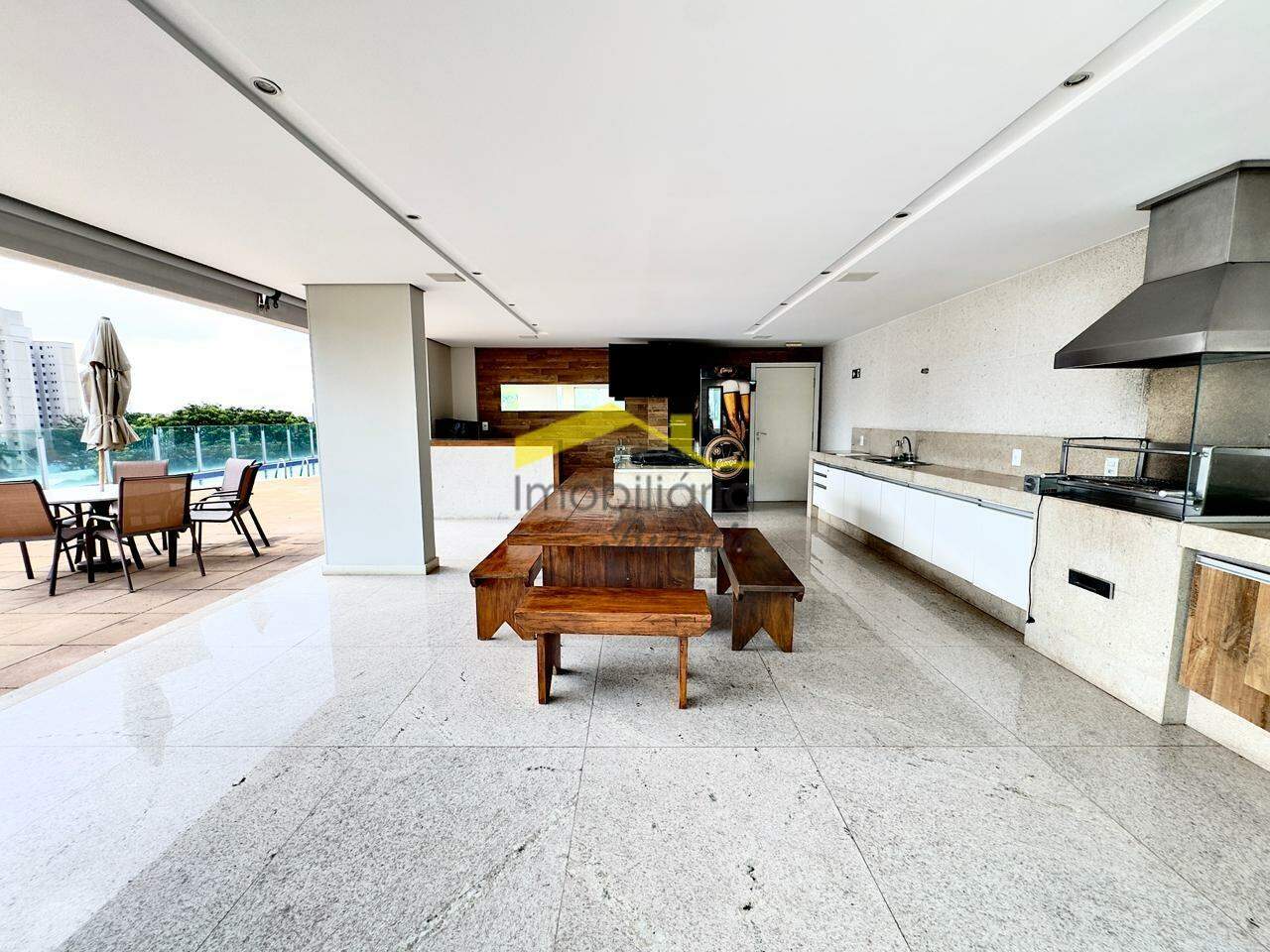 Sala ampla com piso em travertino, integrada à varanda gourmet com churrasqueira e fechamento em vidro;