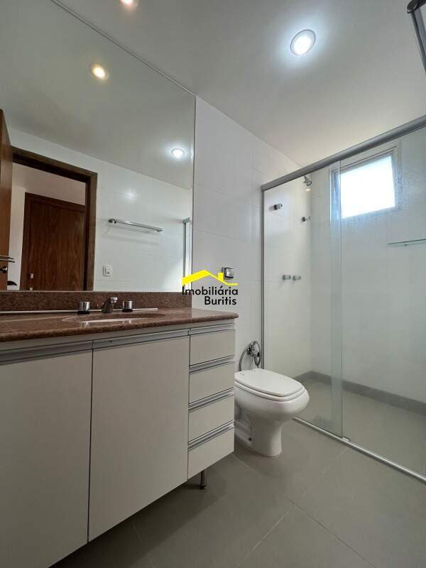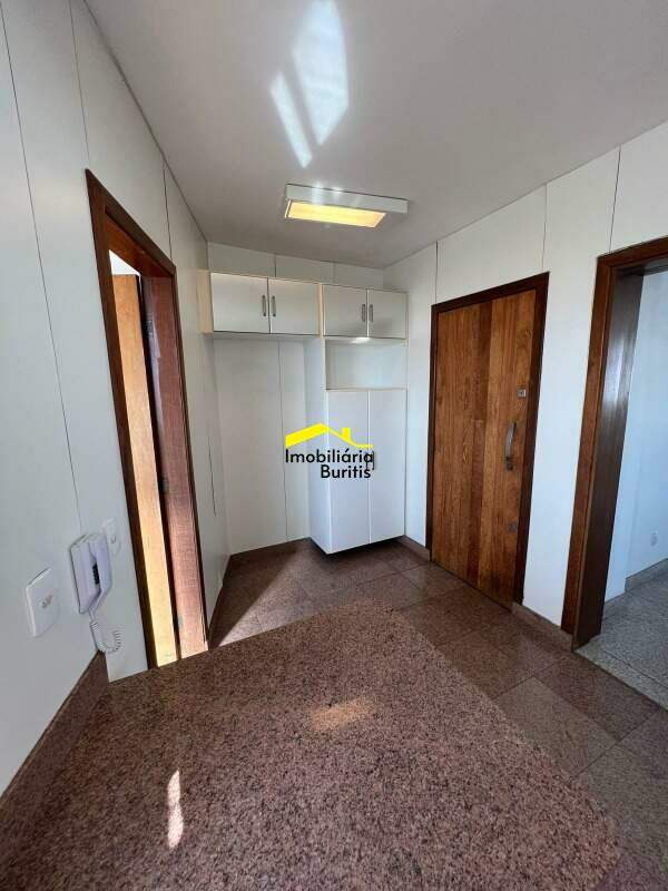 Rouparia no corredor, banho social e suíte com armários espelho e box blindex.