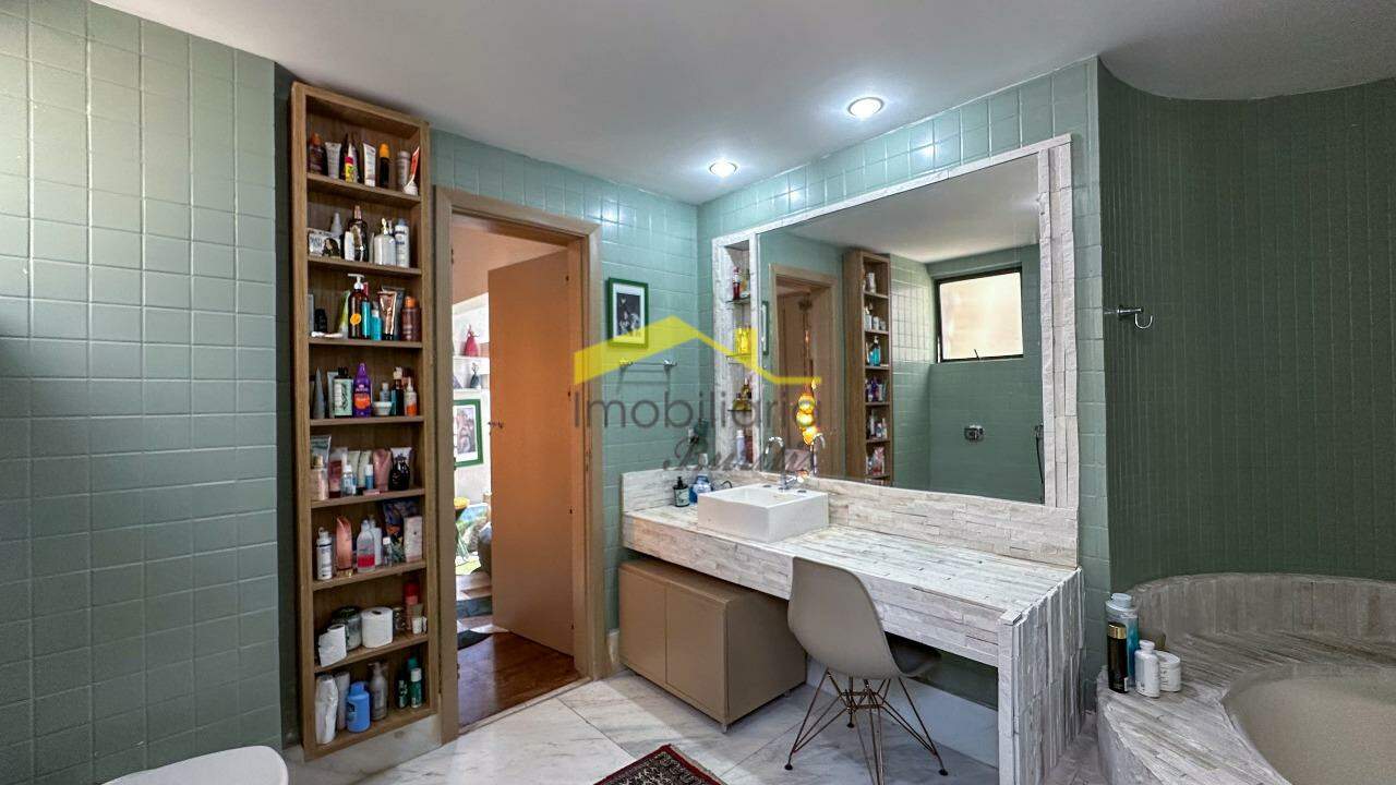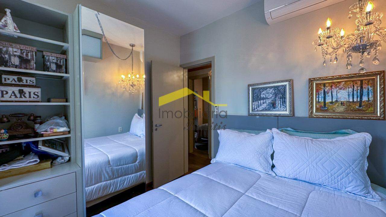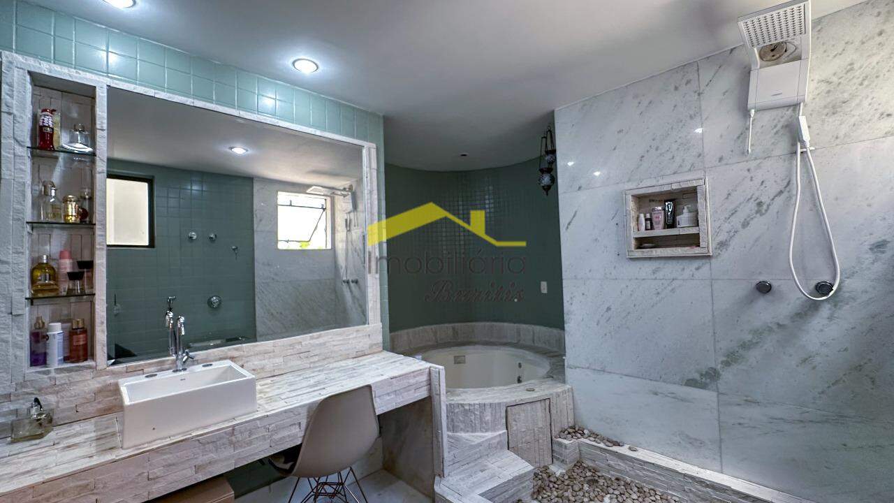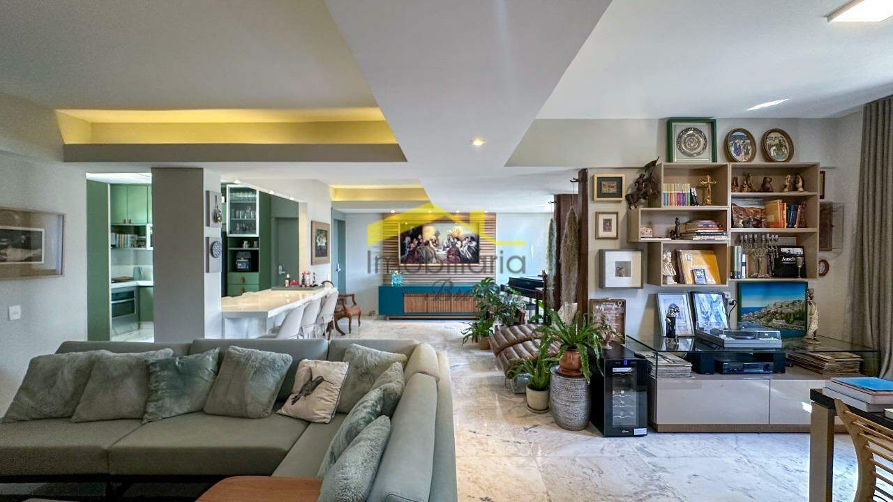 A sala é ampla, para 3 ambientes, com piso em mármore, rebaixamento em gesso e projeto luminotécnico que valoriza cada detalhe. Banho social e suíte com acabamento em mármore, armários, box em blindex e banheira de hidromassagem na suíte.