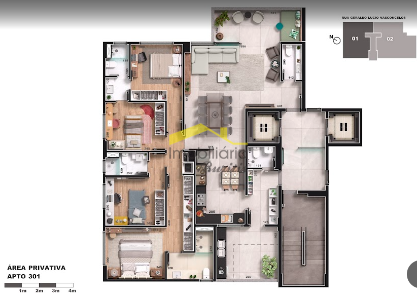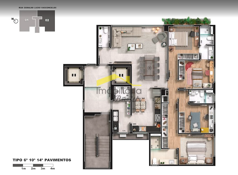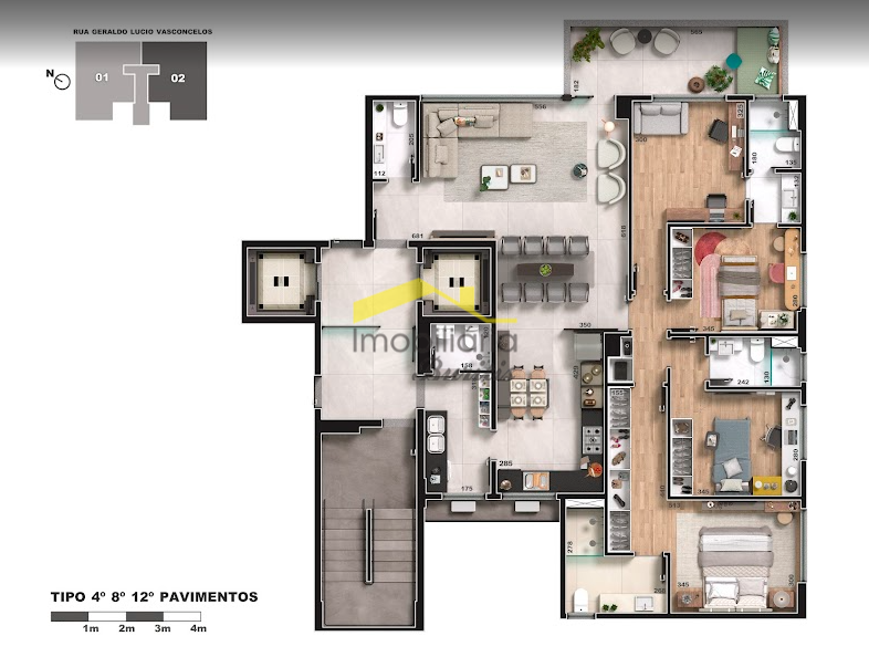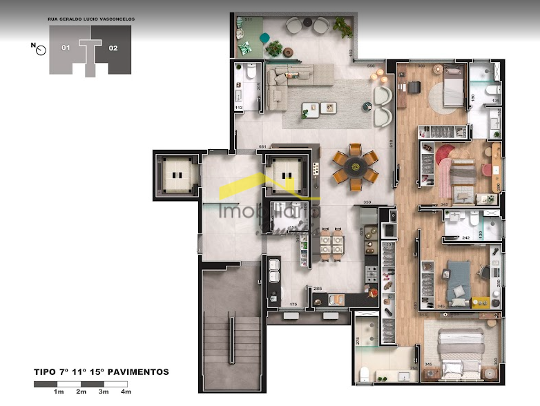 Sala para 2 ambientes em porcelanato (existem unidades com varanda). Lavabo. 4 quartos em piso vinílico, sendo 2 suítes e 2 semi-suítes. Cozinha em porcelanato e área de serviço em porcelanato.