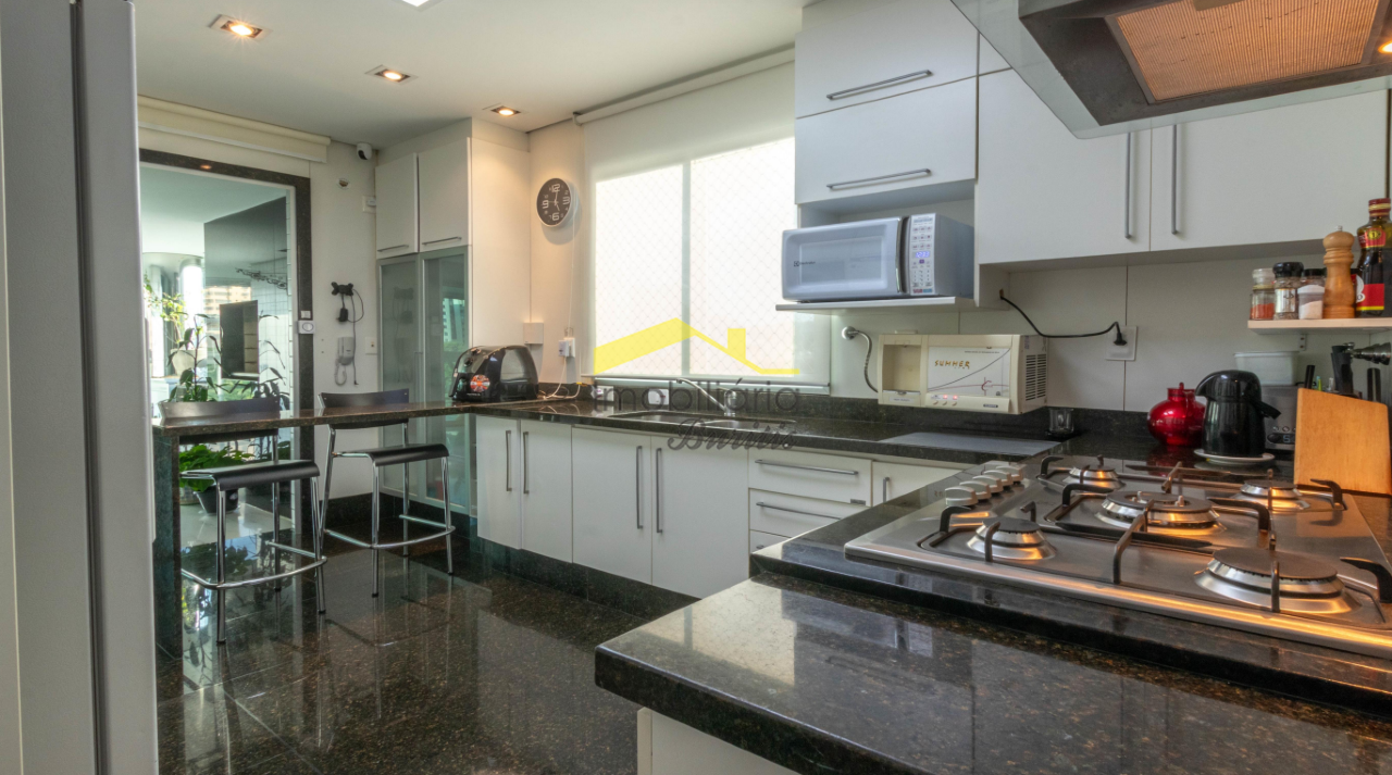 A cozinha é moderna e prática, com armários planejados sob e sobre uma bancada de granito, oferecendo o equilíbrio perfeito entre funcionalidade e design.