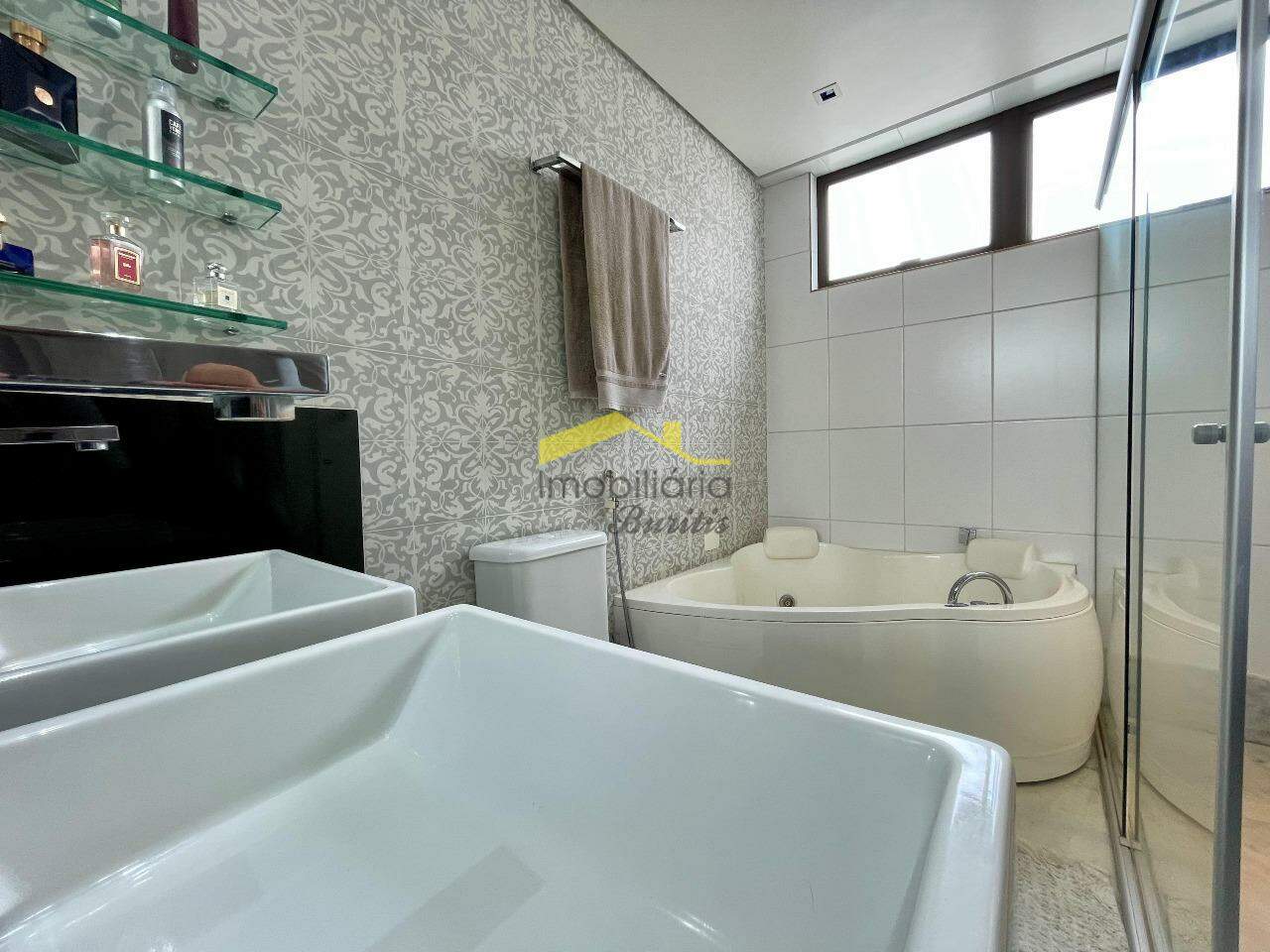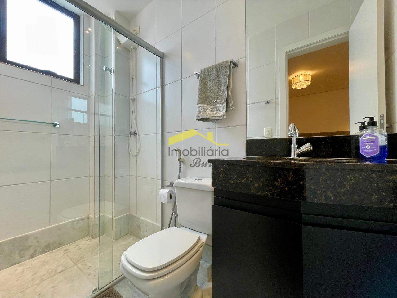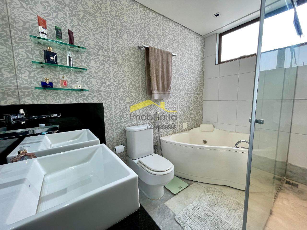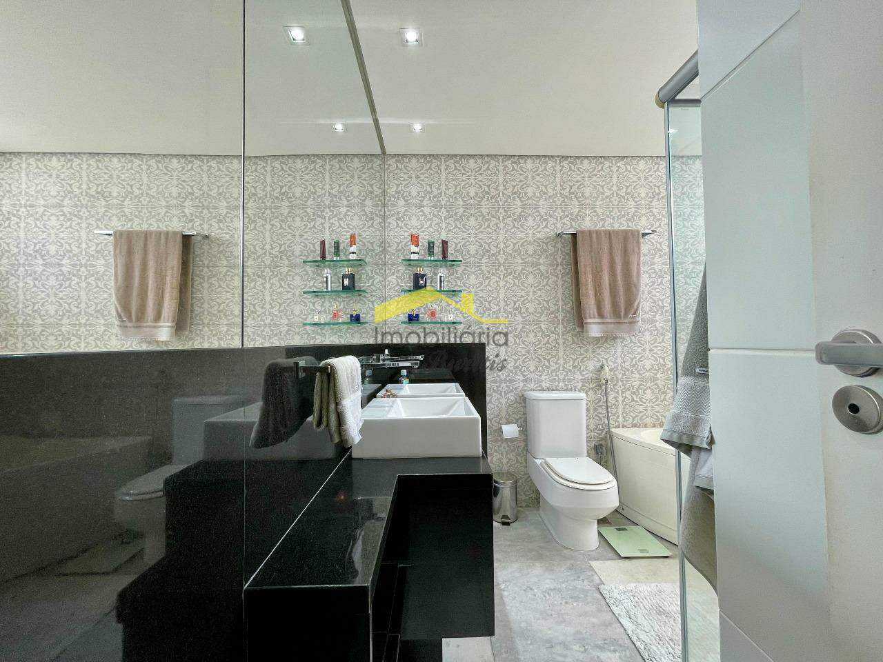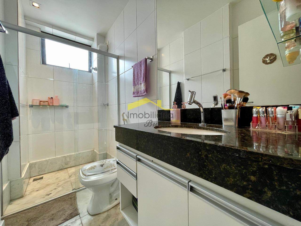 Banheiros: Suítes com acabamento sofisticado em granito, armários planejados, box em vidro temperado, teto rebaixado em gesso com iluminação; suíte master com jacuzzi.