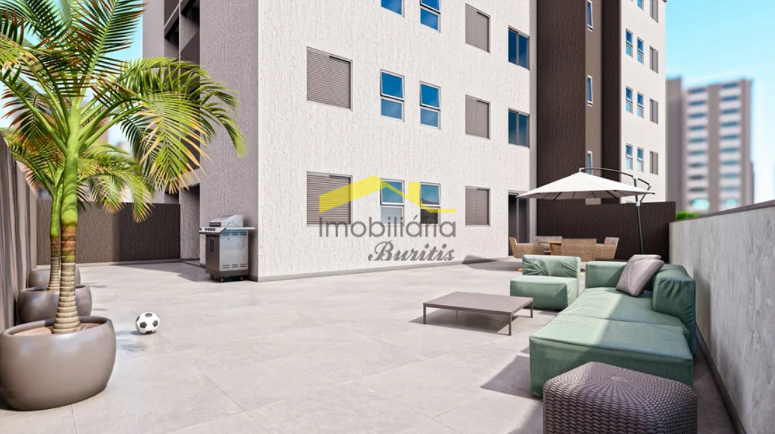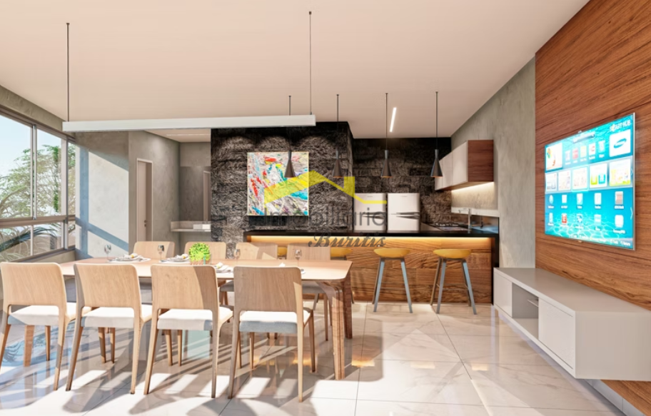 Apartamento de 02 quartos, sendo 1 quarto com suíte, banheiro social, sala para 02 ambientes, cozinha tipo americana com área de serviço e varanda.