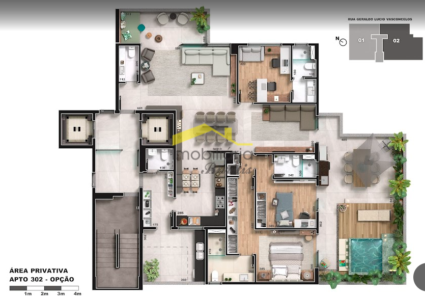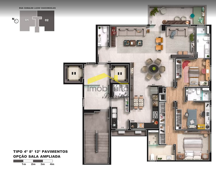 Sala para 2 ambientes em porcelanato (existem unidades com varanda). Lavabo. 4 quartos em piso vinílico, sendo 2 suítes e 2 semi-suítes. Cozinha em porcelanato e área de serviço em porcelanato.