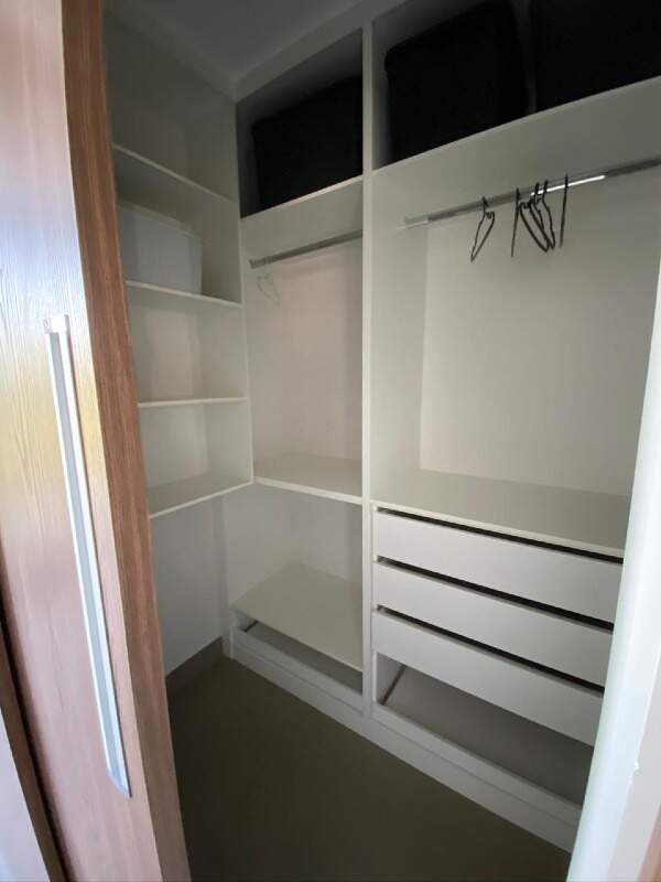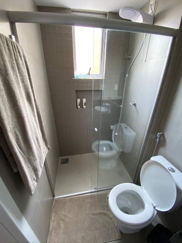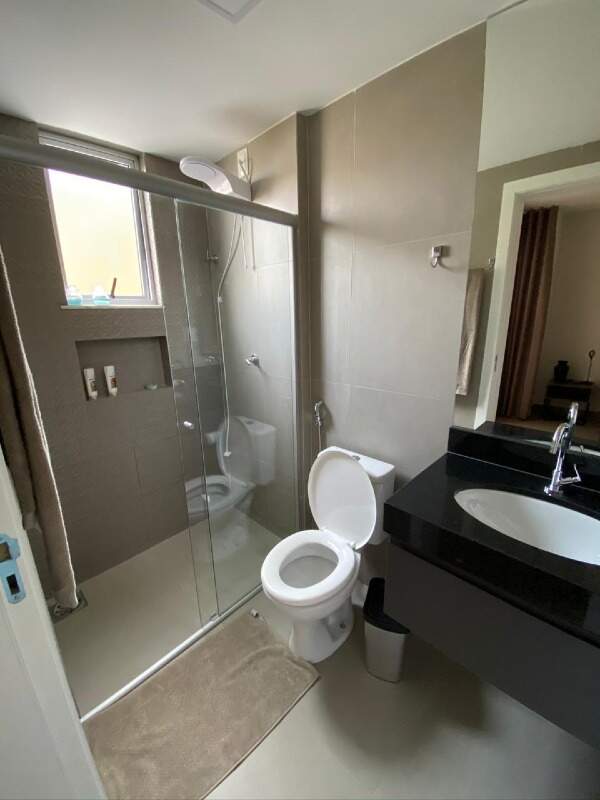 Suite: Suite com closet, painel de acesso ao closet em MDF cor, cama casal padrão AA, ar condicionado, cortina com blackout importado. Banho suíte com armário, espelho, box banheiro, nicho decorativo em porcelanato, chuveiro e ducha higiênica.