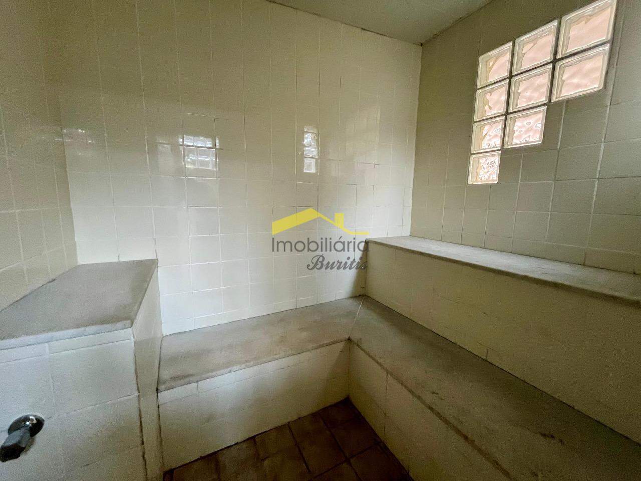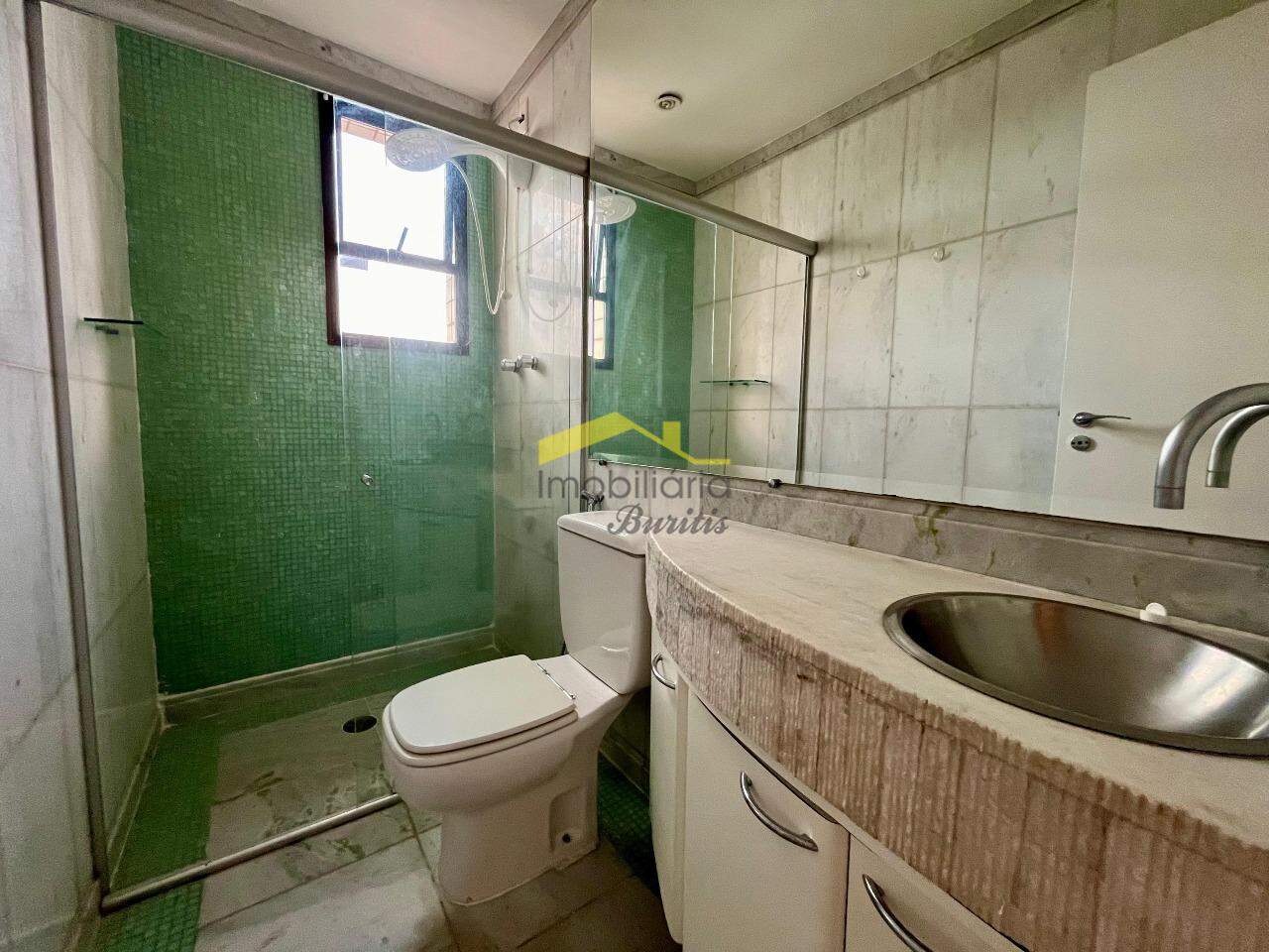 Banho social e suite com armário, espelho e box em vidro blindex.