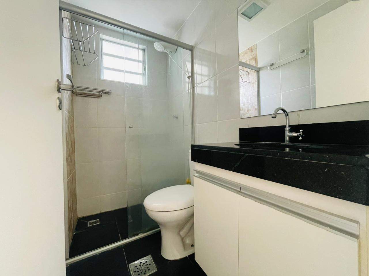 Suíte e banho social com bancada em granito, armário, box em blindex, espelho e piso da suíte em porcelanato e banho social em granito.
