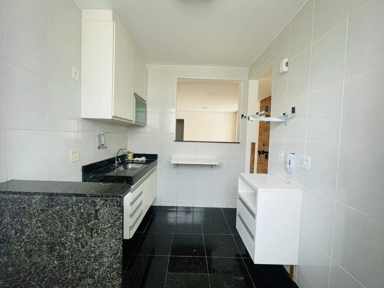 Cozinha americana com armarios planejados, sob e sobre bancada em granito e piso em granito.