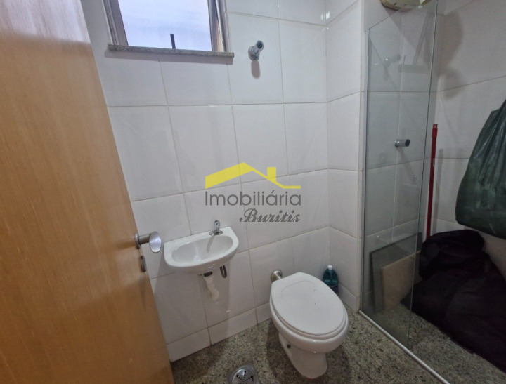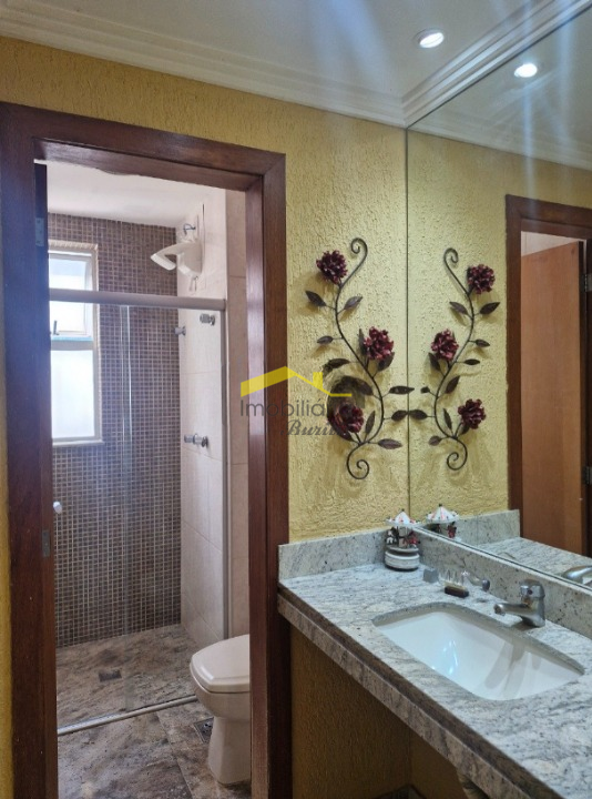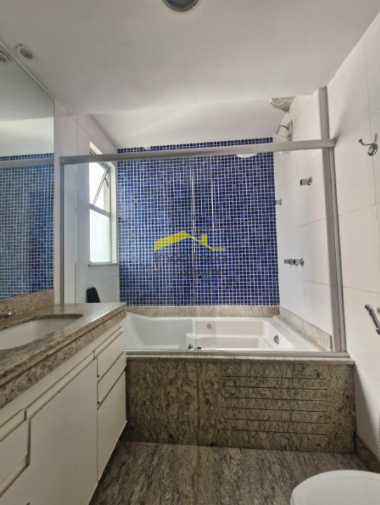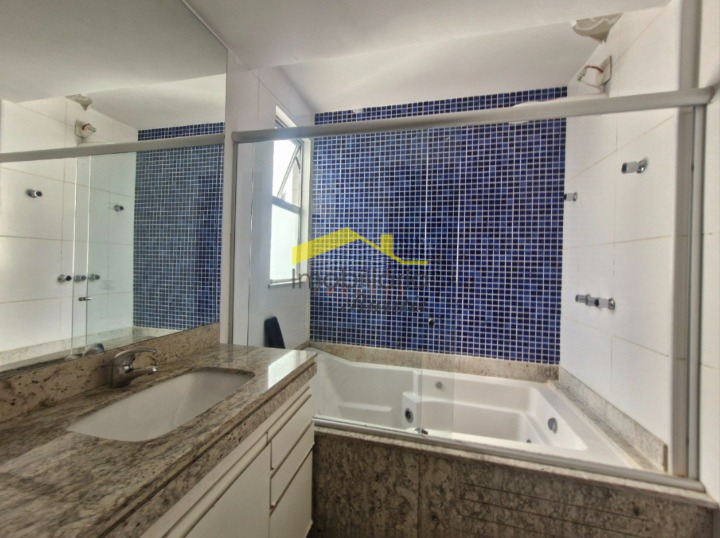 Suíte com bancada em granito, armários, box em blindex e hidromassagem.