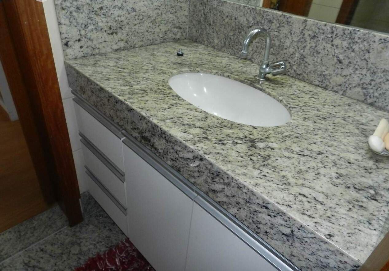Banho suítes e semi suítes com armários sob bancada em granito, espelho e Box;