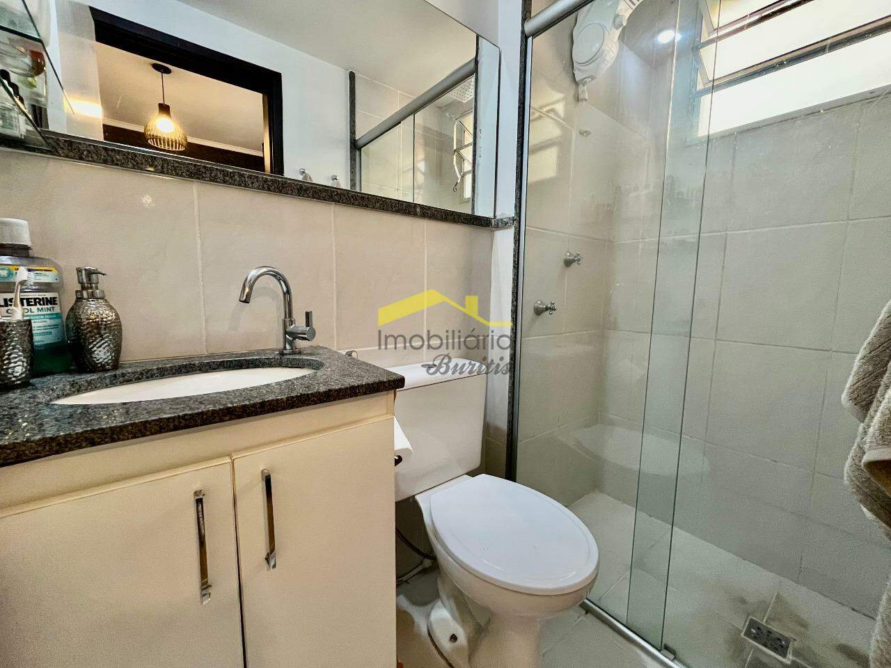 Banheiros com piso em cerâmica, bancada em granito e box em blindex