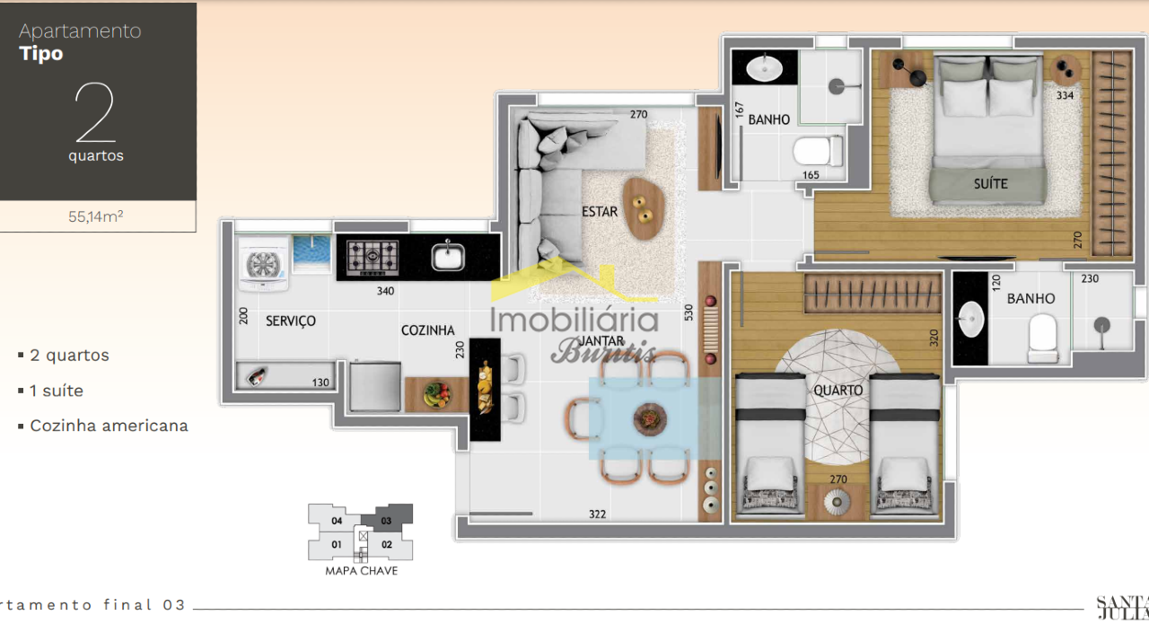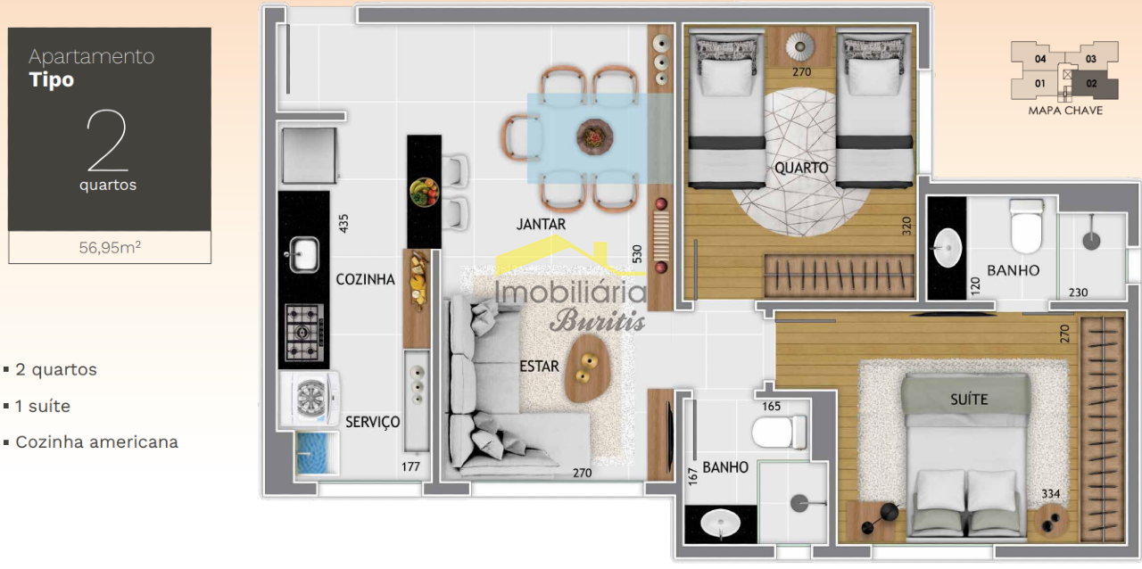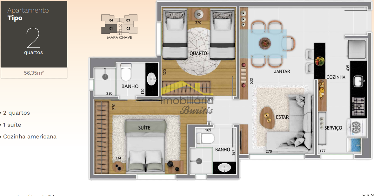 Apartamentos paraportadores de necessidades físicas PNE) de 2 quartos, sendo um suíte, banho social, sala para dois ambientes com cozinha tipo americana e área de serviço.