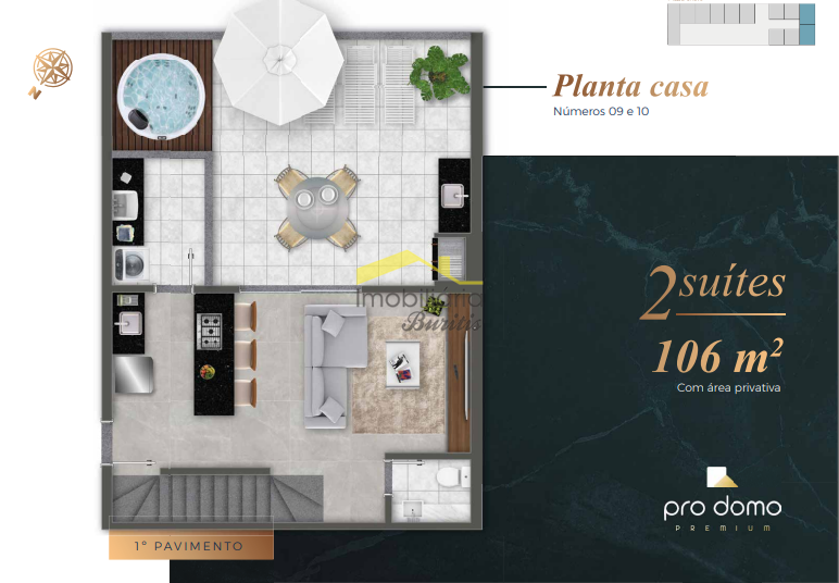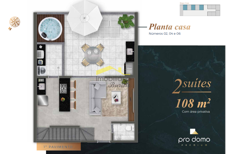 Casa 1 tem 107,35 m2 (69,17 área coberta + 38,18 área descoberta)