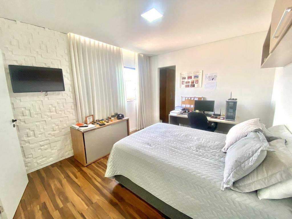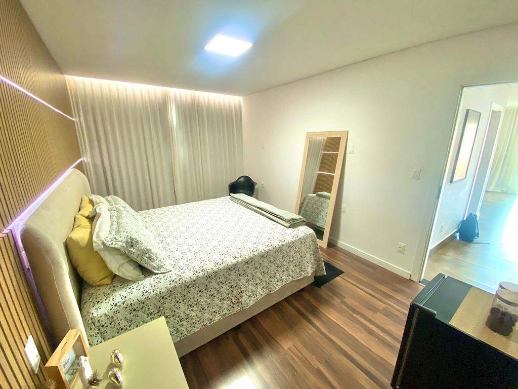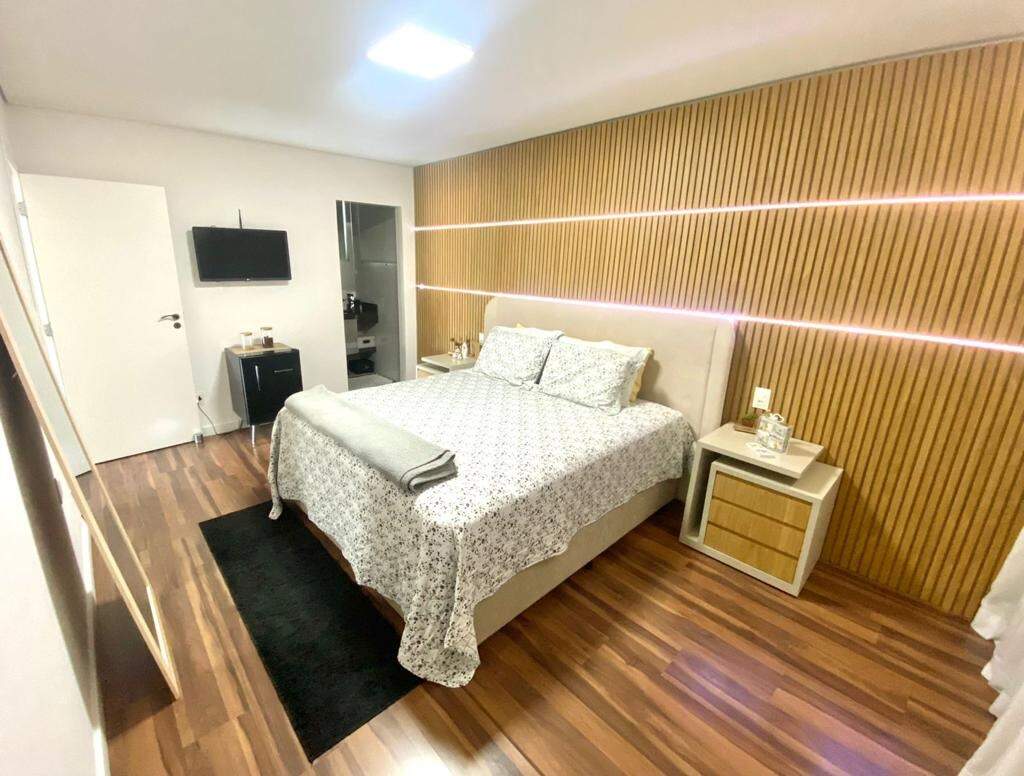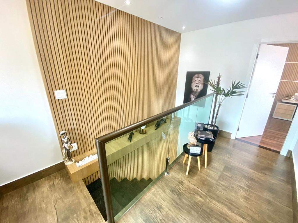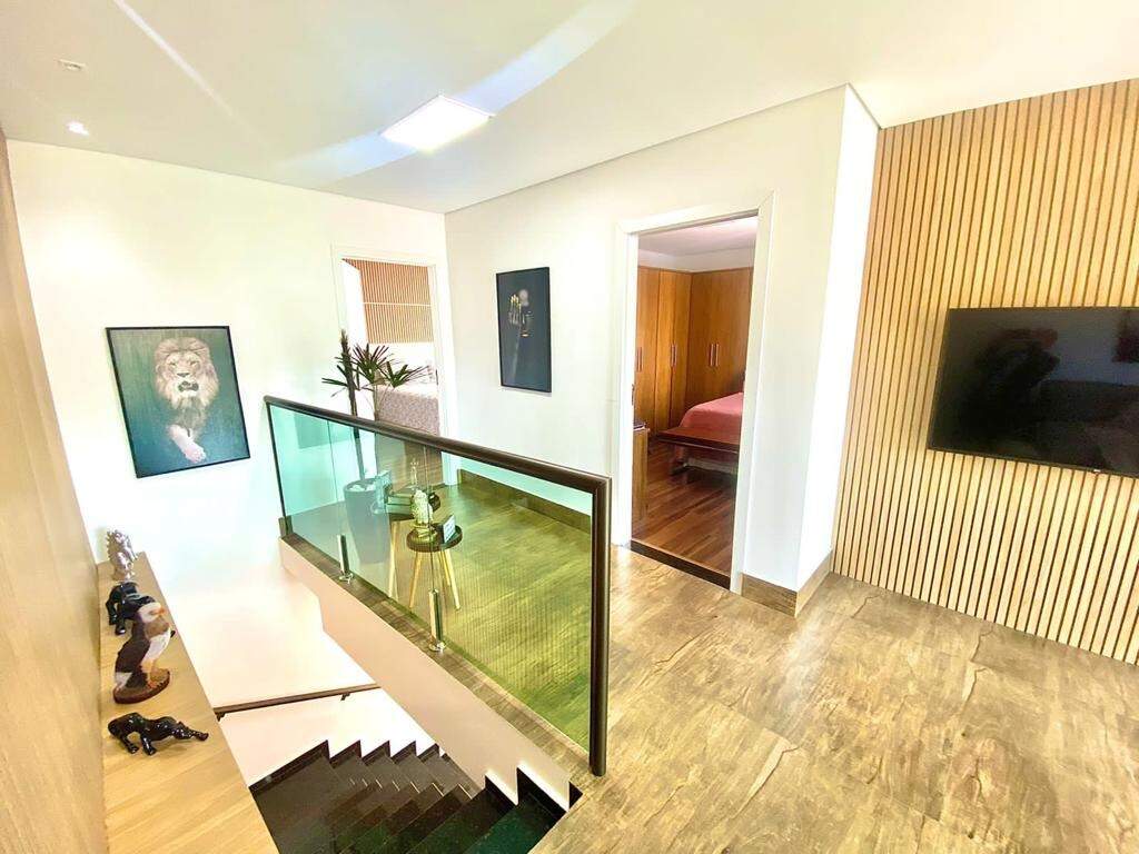 No segundo pavimento, há uma sala de TV com piso em laminado de madeira, rebaixamento em gesso, iluminação planejada e painel de madeira, varanda com piso em porcelanato e guarda corpo em blindex, dois quartos com piso em laminado de madeira, sendo um montado com armários planejados e uma suíte master, suíte master com bancada em granito, box em blindex, hidromassagem, espelho e piso em granito.