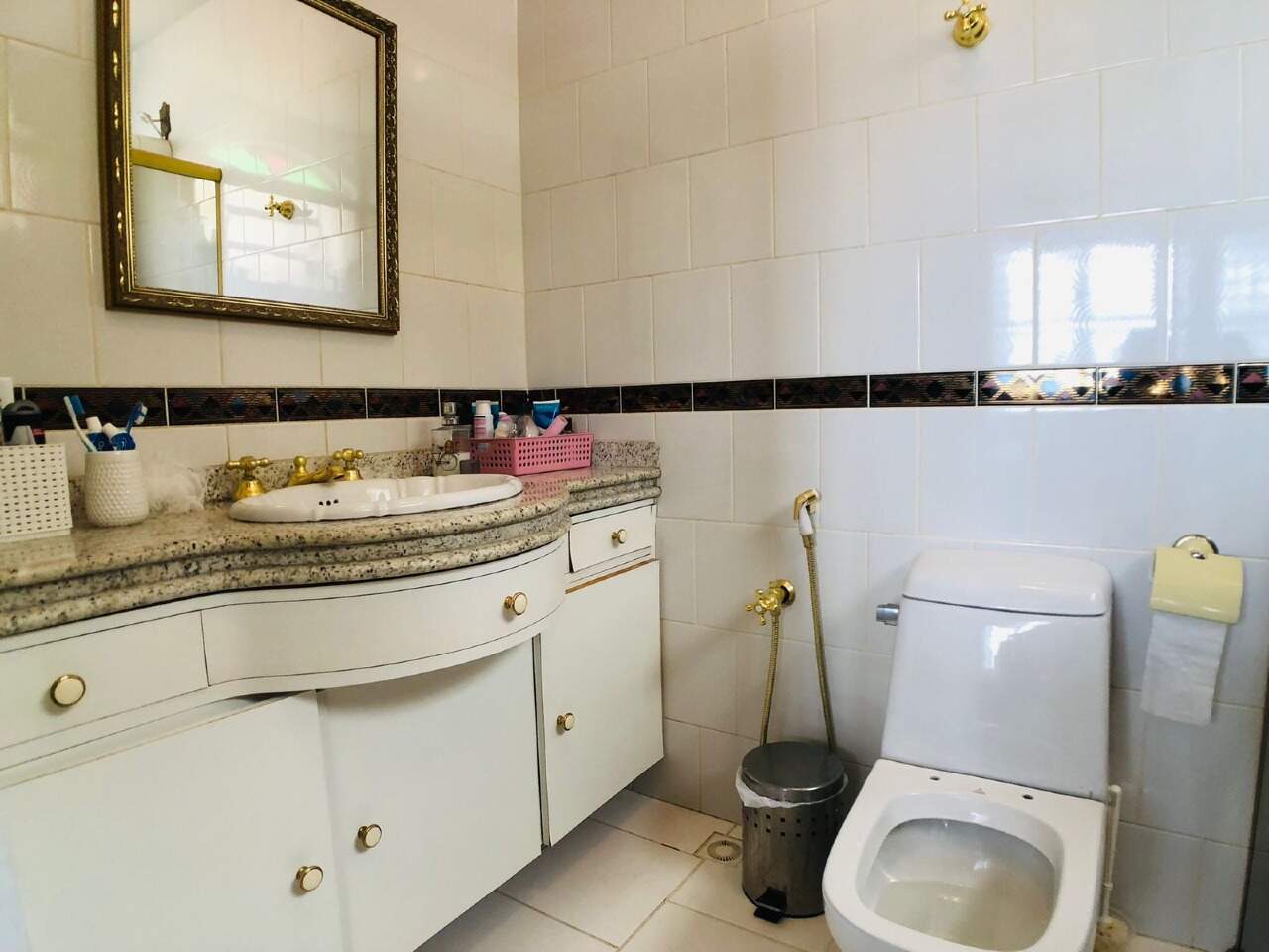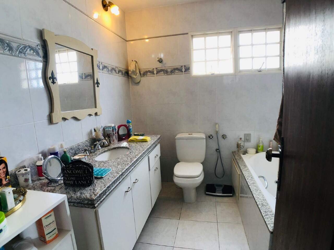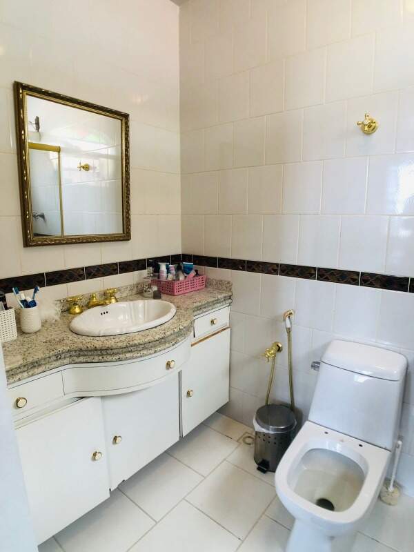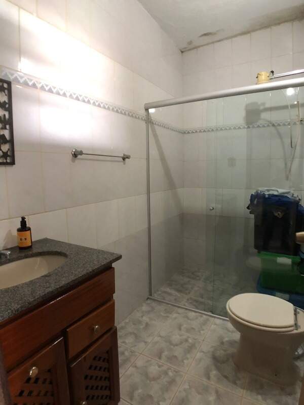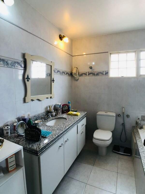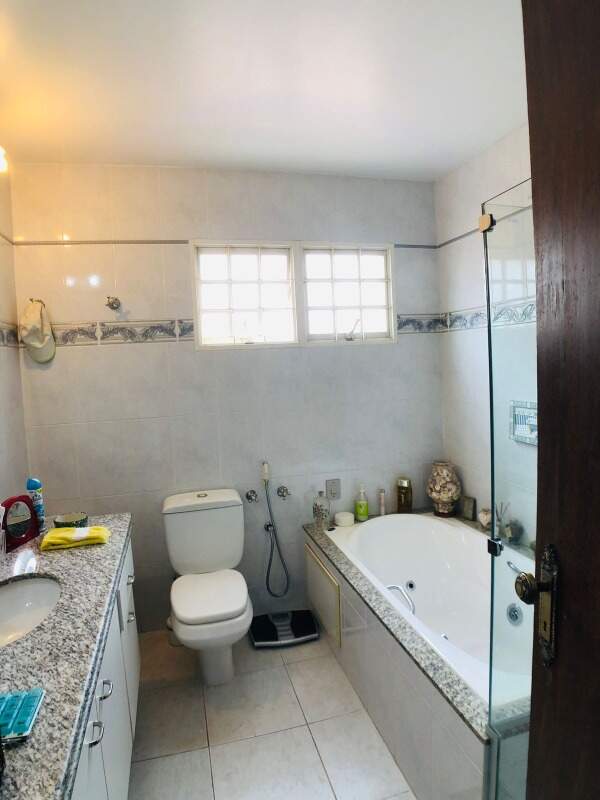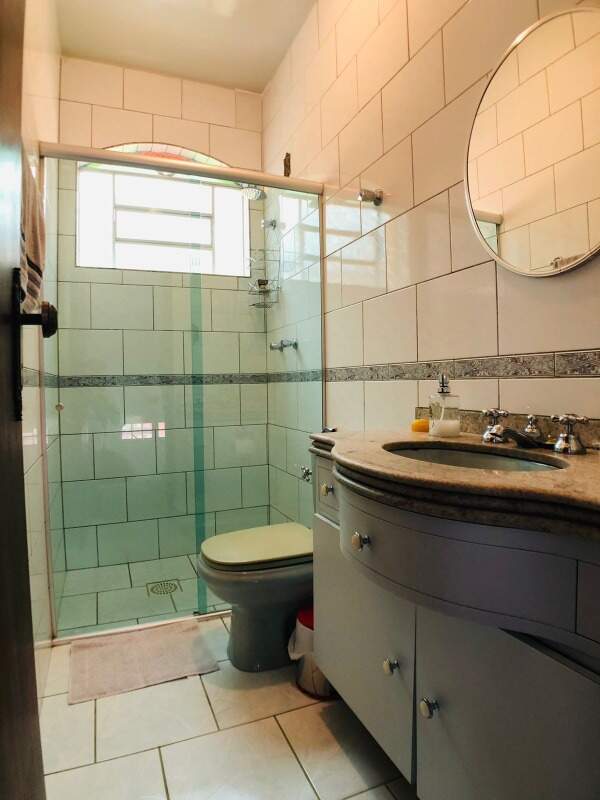 Banho social com armário, piso em ceramica, bancada em granito e box em blindex.
