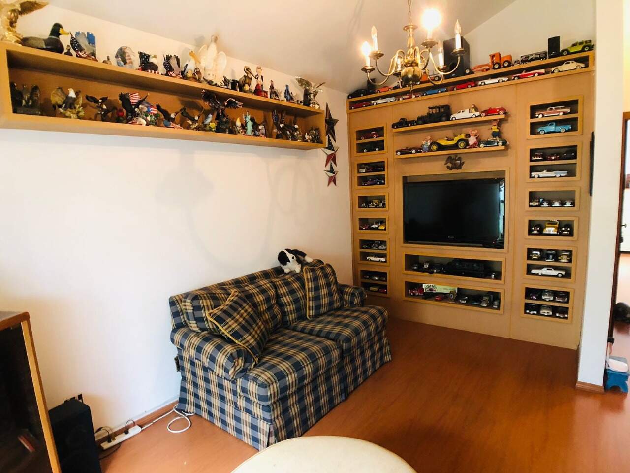 Sala de TV com piso em tabua corrida.