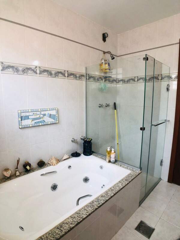 Suíte com armário, bancada em granito, box em blindex, hidromassagem, espelho e piso em ceramica.