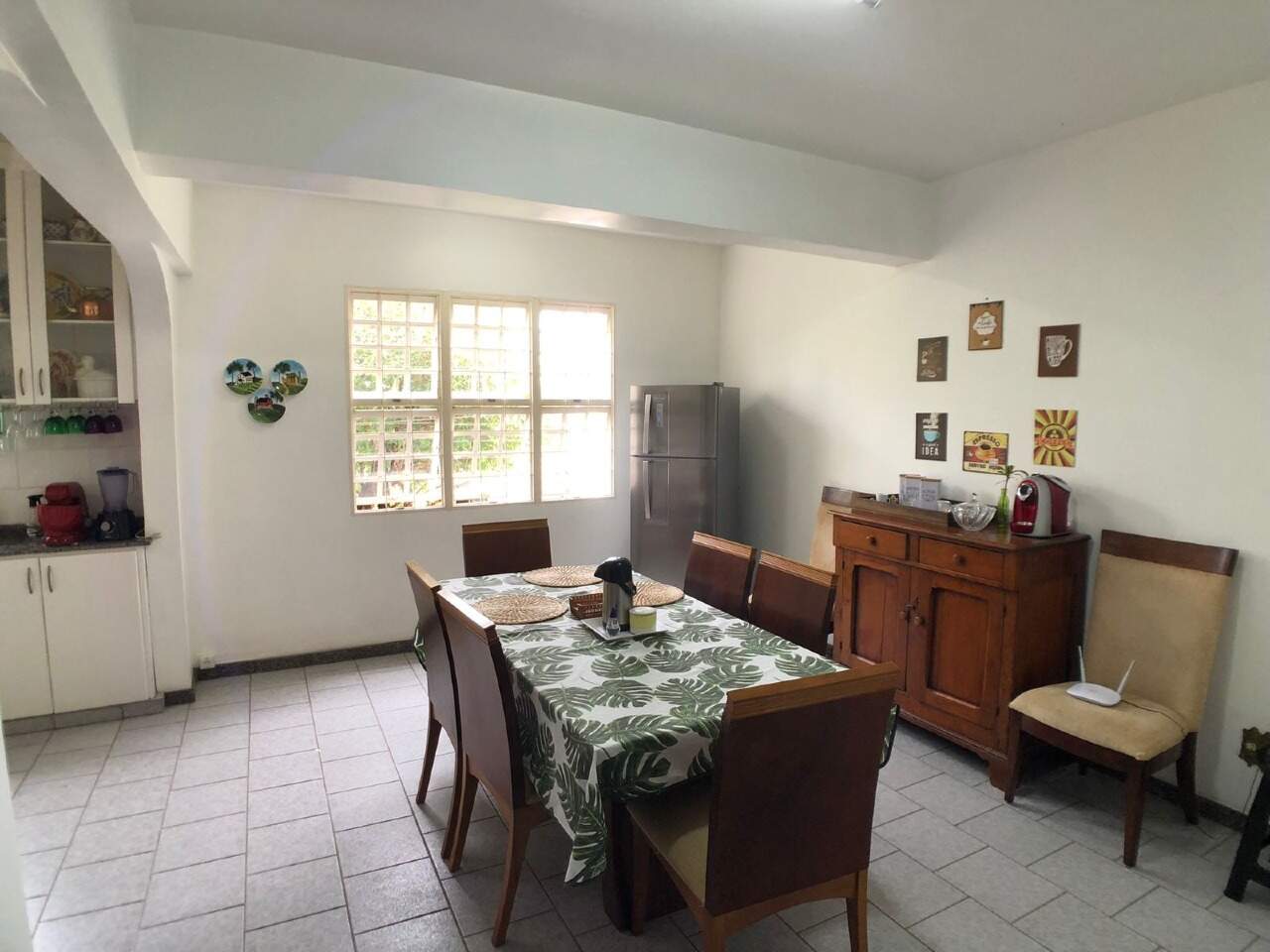 Sala de jantar com piso em tabua corrida.