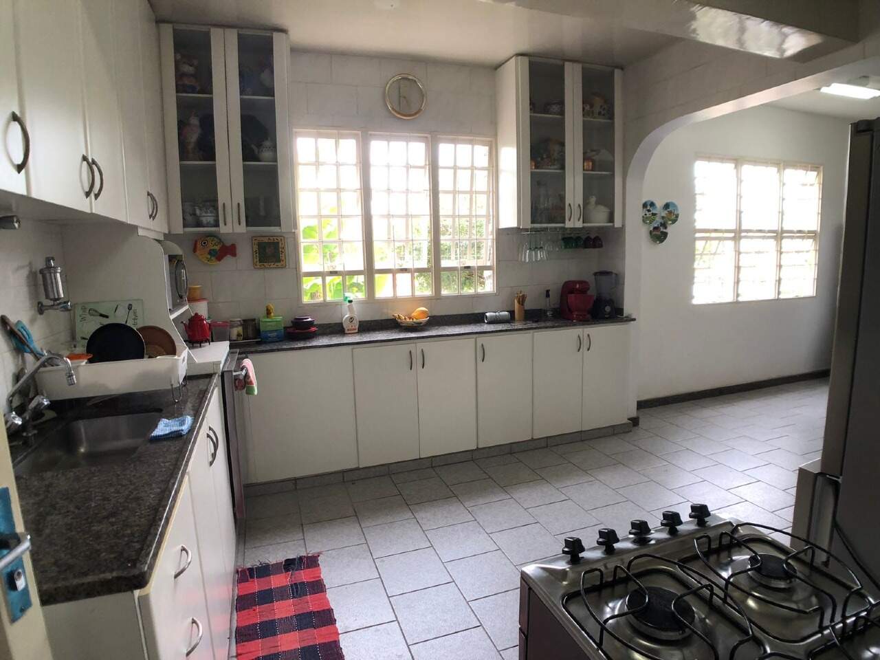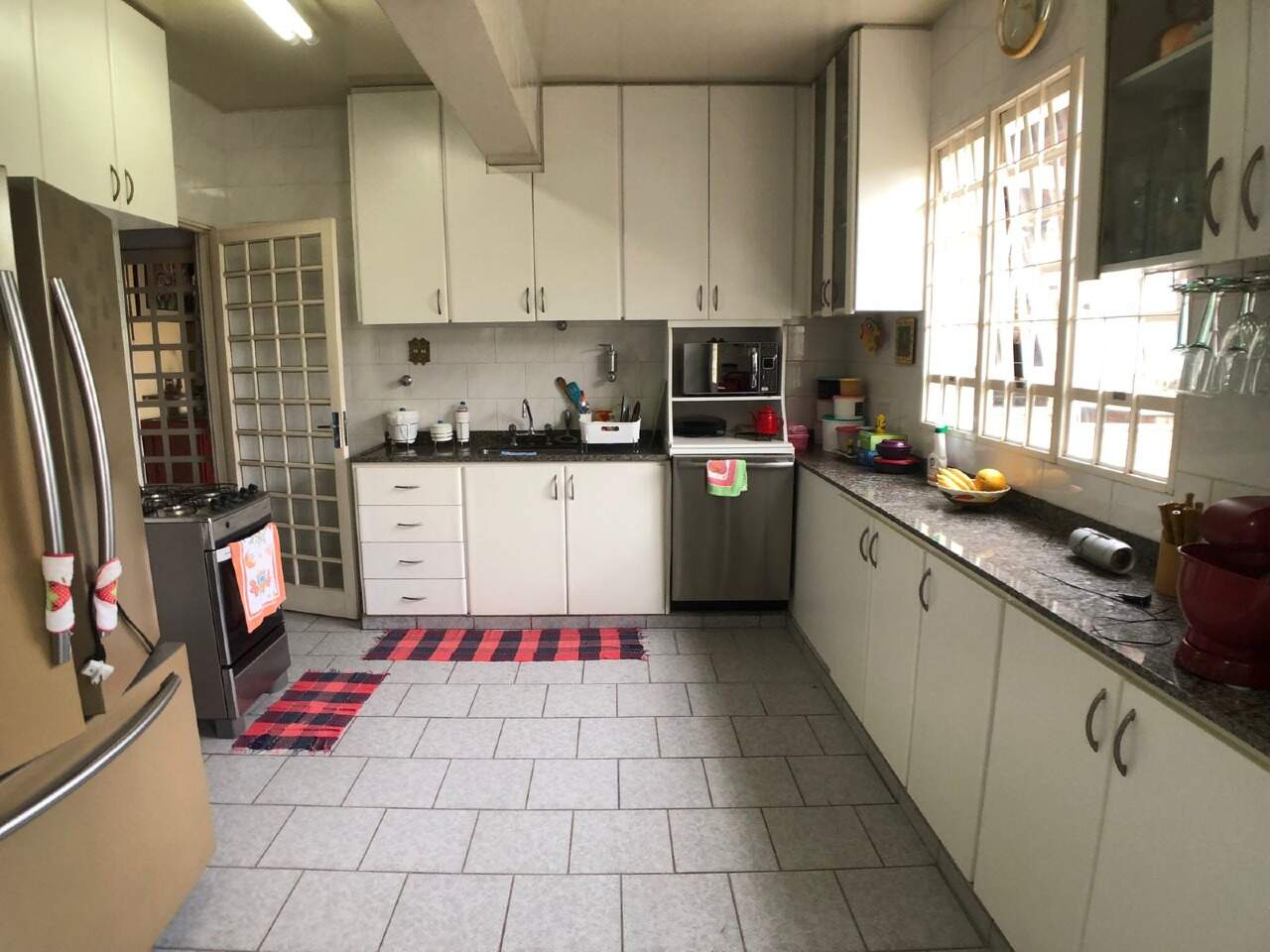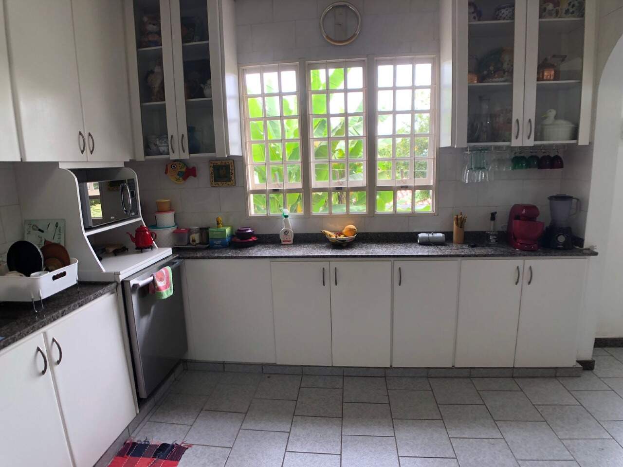 Cozinha montada com armarios planejados, sob e sobre bancada em granito e piso em ceramica.