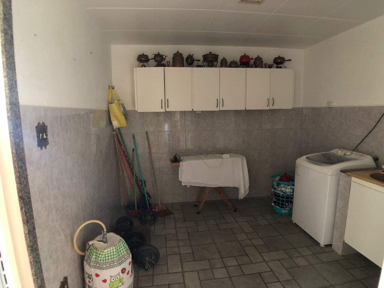 Área de serviço montada com armarios e piso em ceramica.