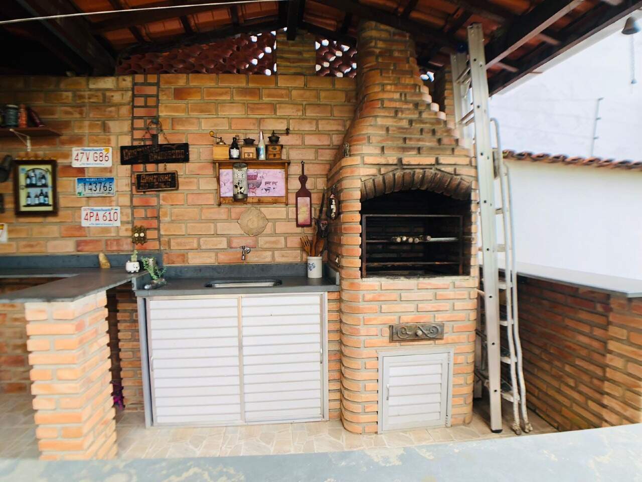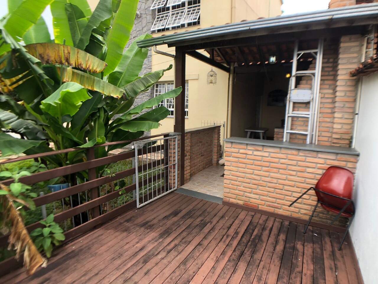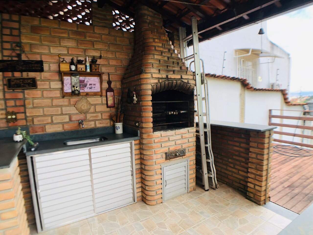 Espaço gourmet com churrasqueira, piso em ceramica, deck de madeira e jardins.