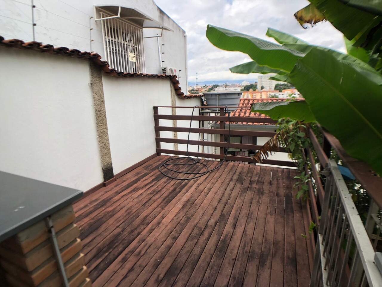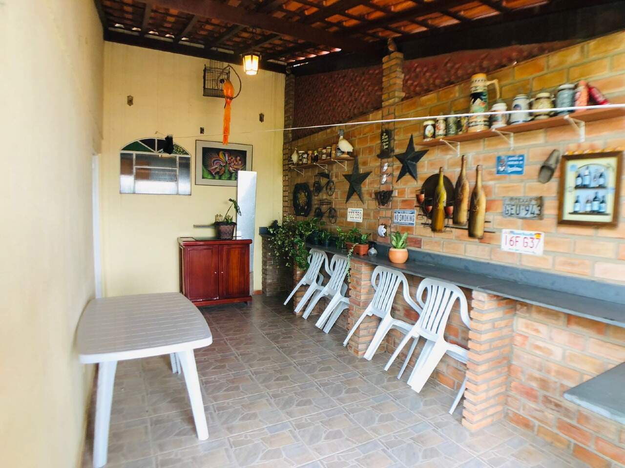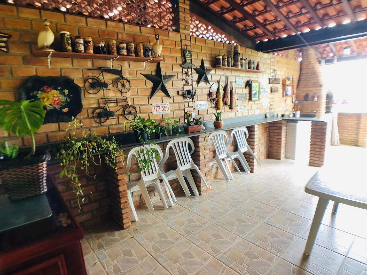 Espaço gourmet com churrasqueira, piso em ceramica, deck de madeira e jardins.