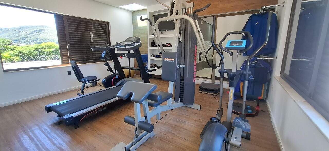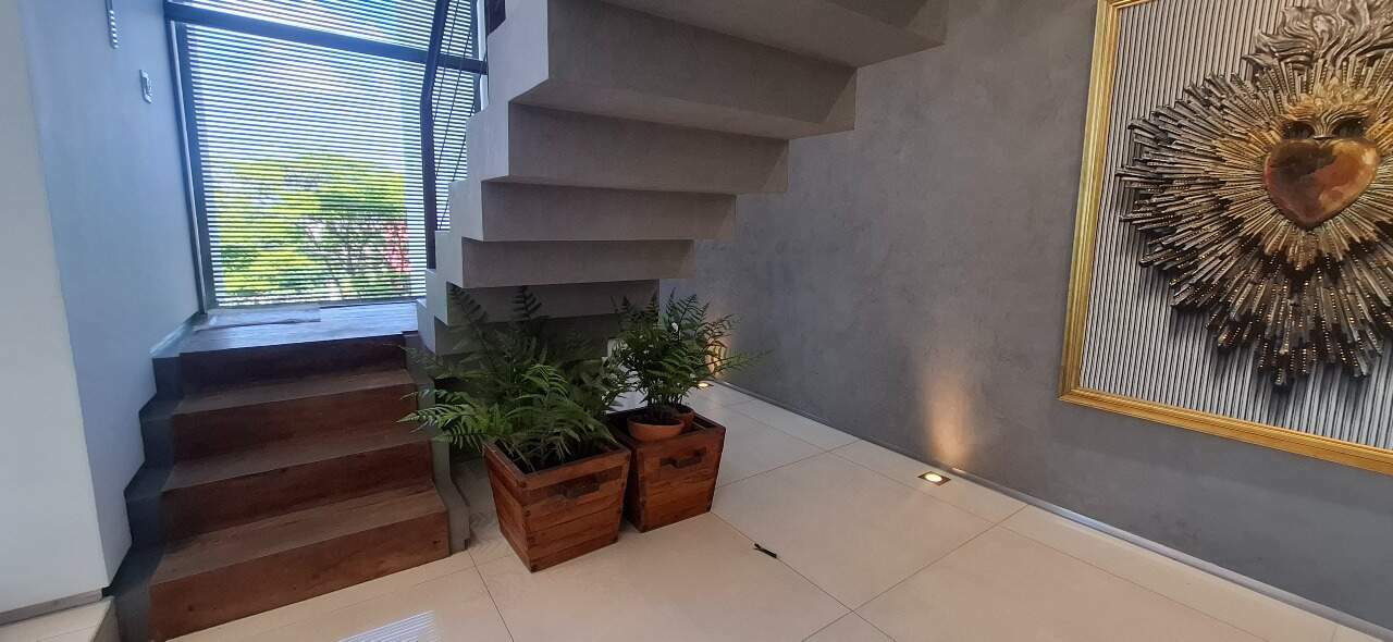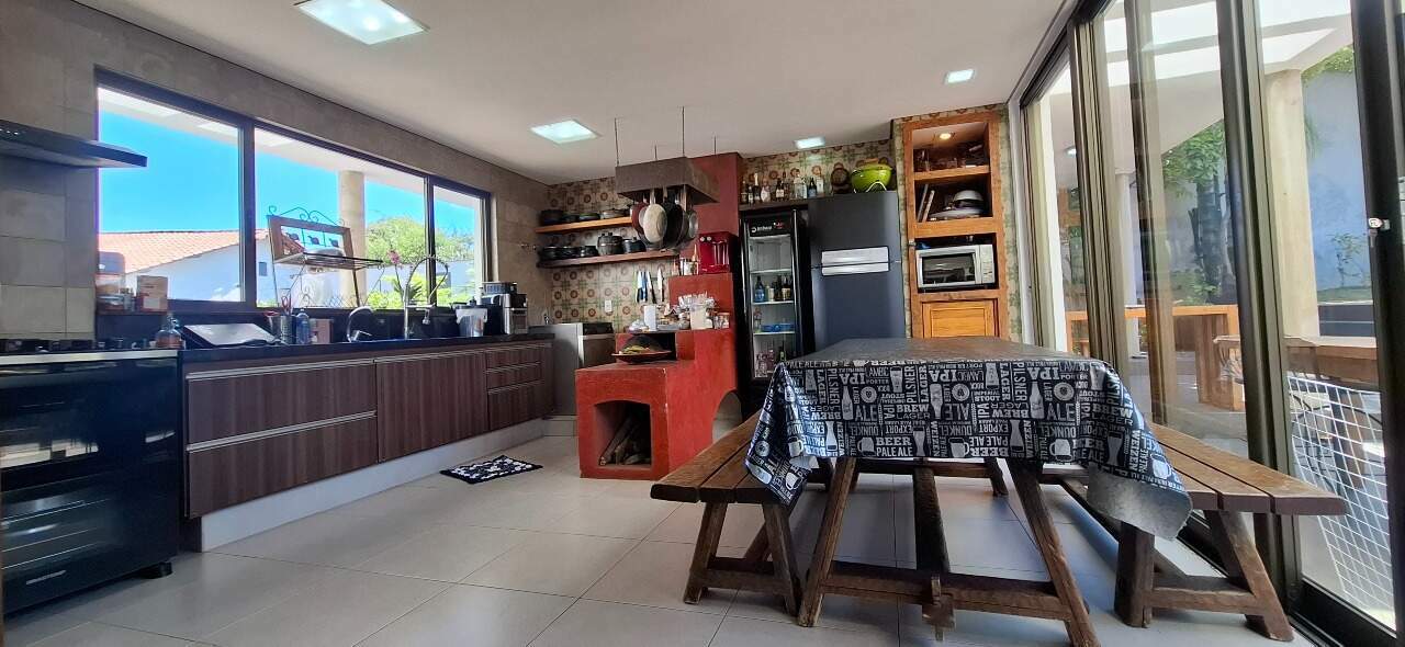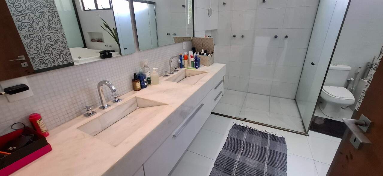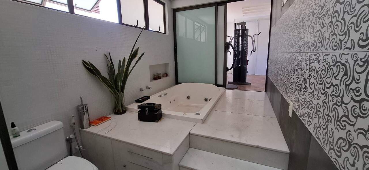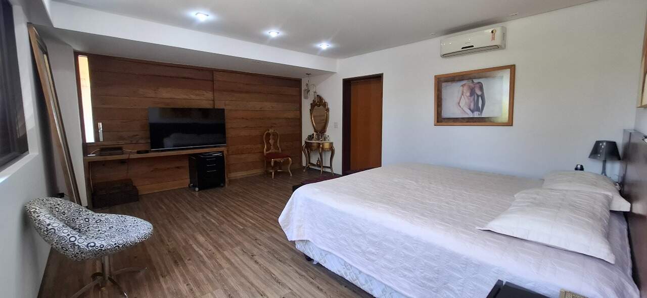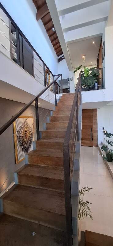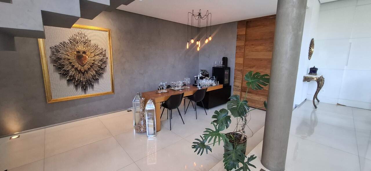 Sala para três ambientes, pé direito alto, piso em porcelanato, teto com rebaixamento em gesso com iluminação embutida, lavabo decorado, sala de tv com pé direito alto, piso em porcelanato, escadaria em alvearia com acabamento em marmorato, corrimão de ferro polido, Hall com teto rebaixado em gesso com iluminação embutida, área de circulação com armário, planejado, piso em vinilico, quatro quartos sendo três quartos quartos com suíte e varanda, banheiro dos três quartos com armário, espelho e box em blindex, piso em porcelanato, bancadas em mármore italiano dois quartos com ar condicionado, amplo quarto da suíte master, piso em vinilico, teto com rebaixamento em gesso com iluminação embutida, closet, banheiro da suíte master com ar condicinado, armário, espelho e box em blindex, bancada em mármore italiano, banheira com hidromassagem, academia, sauna, cozinha com teto rebaixado em gesso e iluminação embutida, piso em porcelanato, bancadas com armários planejados, ilha com fogão cook top, coifa, com armários planejado, despensa, espaço gourmet integrado com a cozinha, piso em porcelanato, teto rebaixado em gesso com iluminação embutida, bancada em granito e armário planejados, fogão a lenha., vestiário, lavanderia, DCE, vagas de garagem cobertas.