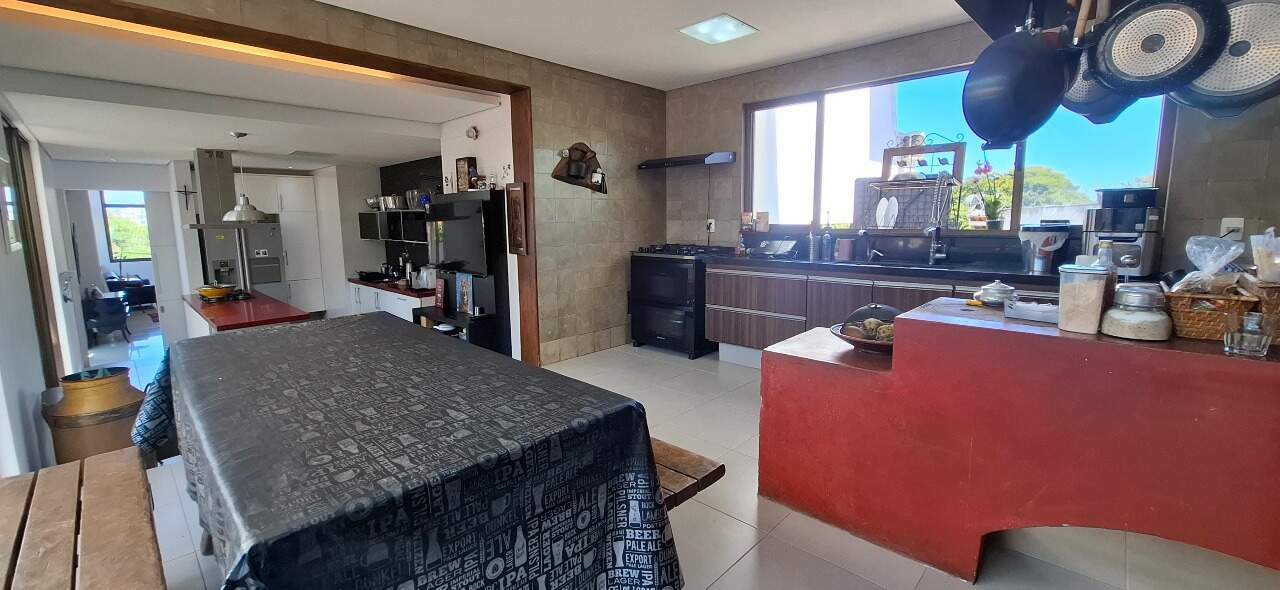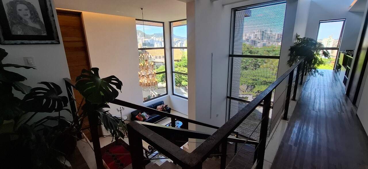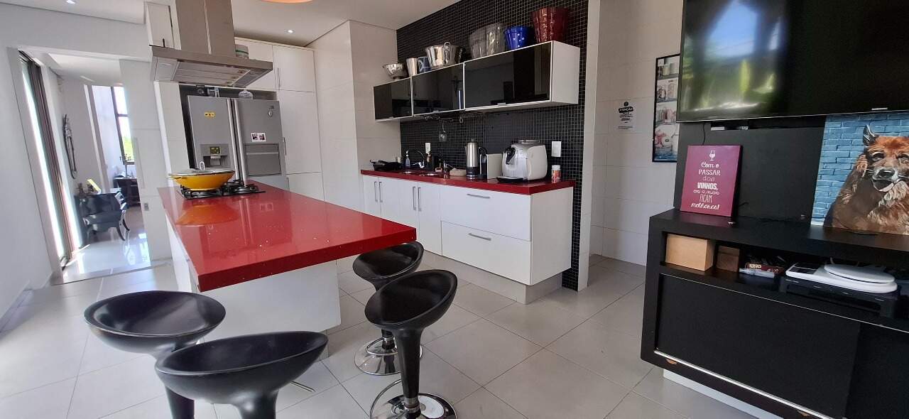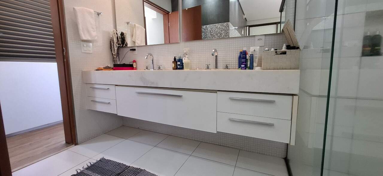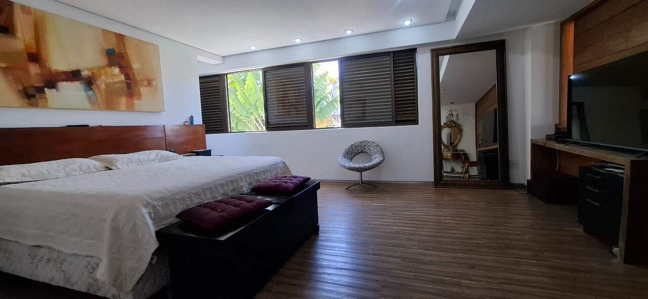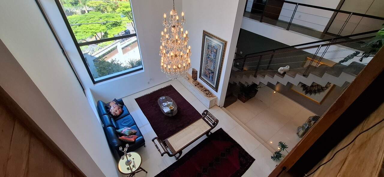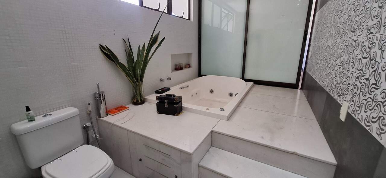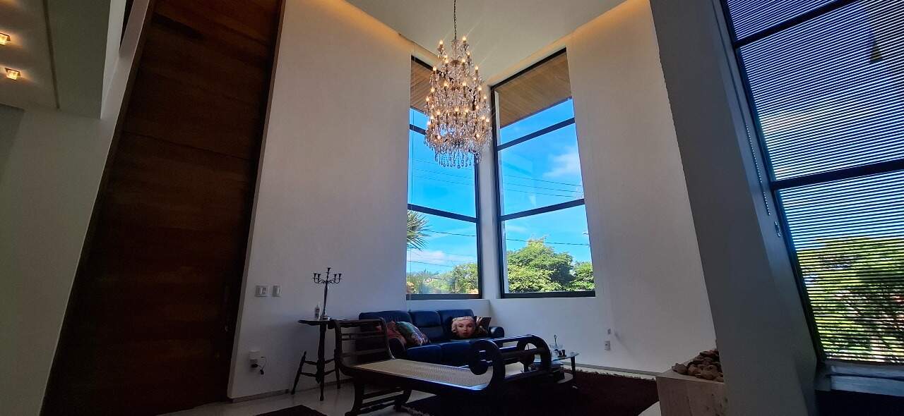 Sala para três ambientes, pé direito alto, piso em porcelanato, teto com rebaixamento em gesso com iluminação embutida, lavabo decorado, sala de tv com pé direito alto, piso em porcelanato, escadaria em alvearia com acabamento em marmorato, corrimão de ferro polido, Hall com teto rebaixado em gesso com iluminação embutida, área de circulação com armário, planejado, piso em vinilico, quatro quartos sendo três quartos quartos com suíte e varanda, banheiro dos três quartos com armário, espelho e box em blindex, piso em porcelanato, bancadas em mármore italiano dois quartos com ar condicionado, amplo quarto da suíte master, piso em vinilico, teto com rebaixamento em gesso com iluminação embutida, closet, banheiro da suíte master com ar condicinado, armário, espelho e box em blindex, bancada em mármore italiano, banheira com hidromassagem, academia, sauna, cozinha com teto rebaixado em gesso e iluminação embutida, piso em porcelanato, bancadas com armários planejados, ilha com fogão cook top, coifa, com armários planejado, despensa, espaço gourmet integrado com a cozinha, piso em porcelanato, teto rebaixado em gesso com iluminação embutida, bancada em granito e armário planejados, fogão a lenha., vestiário, lavanderia, DCE, vagas de garagem cobertas.