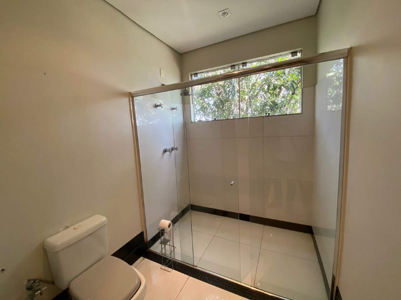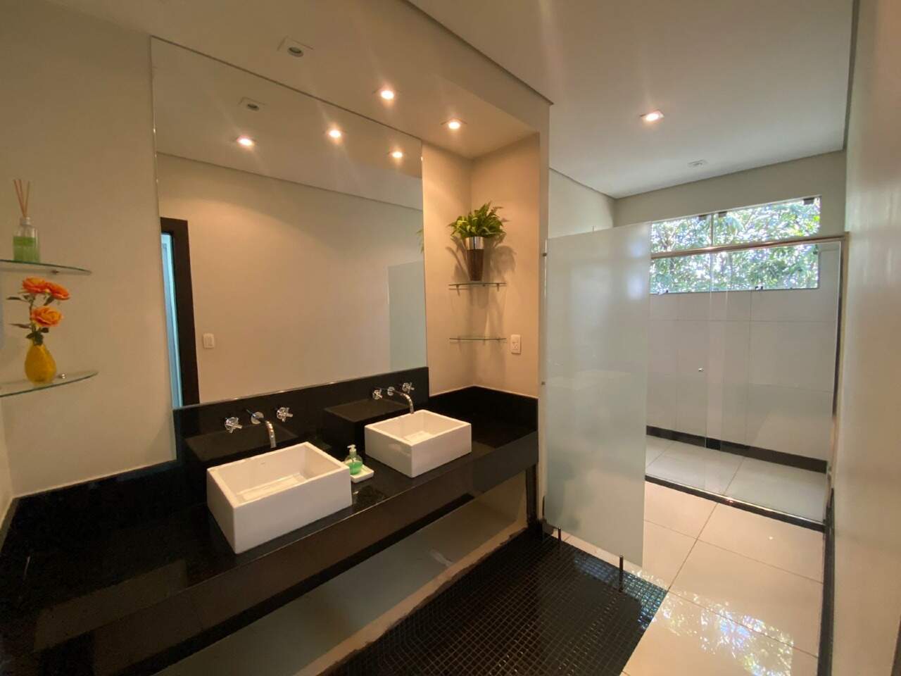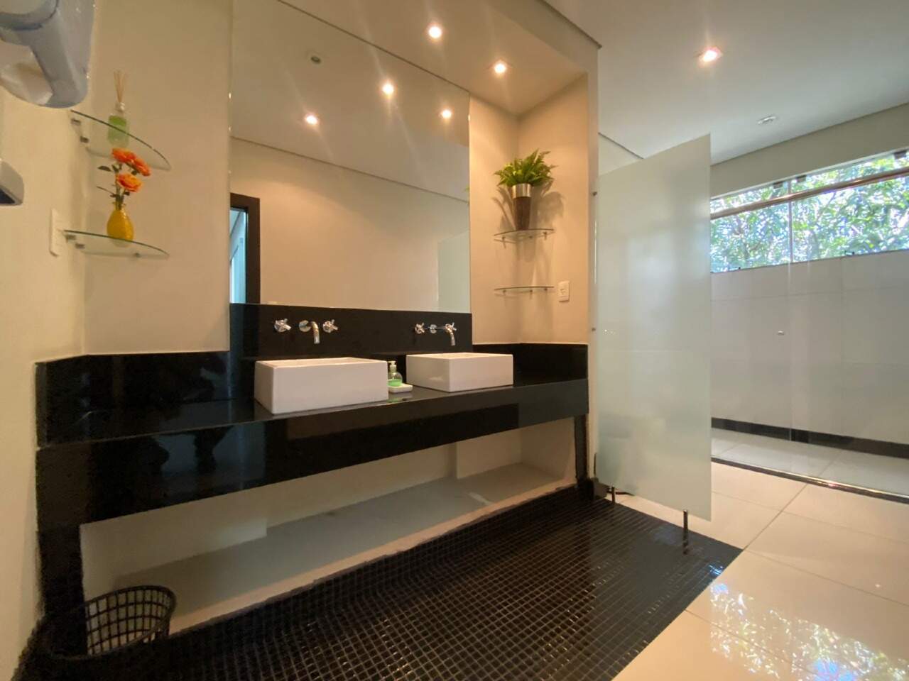 Suíte e banho social com bancada em granito, armário, box em blindex, espelho e piso em granito.